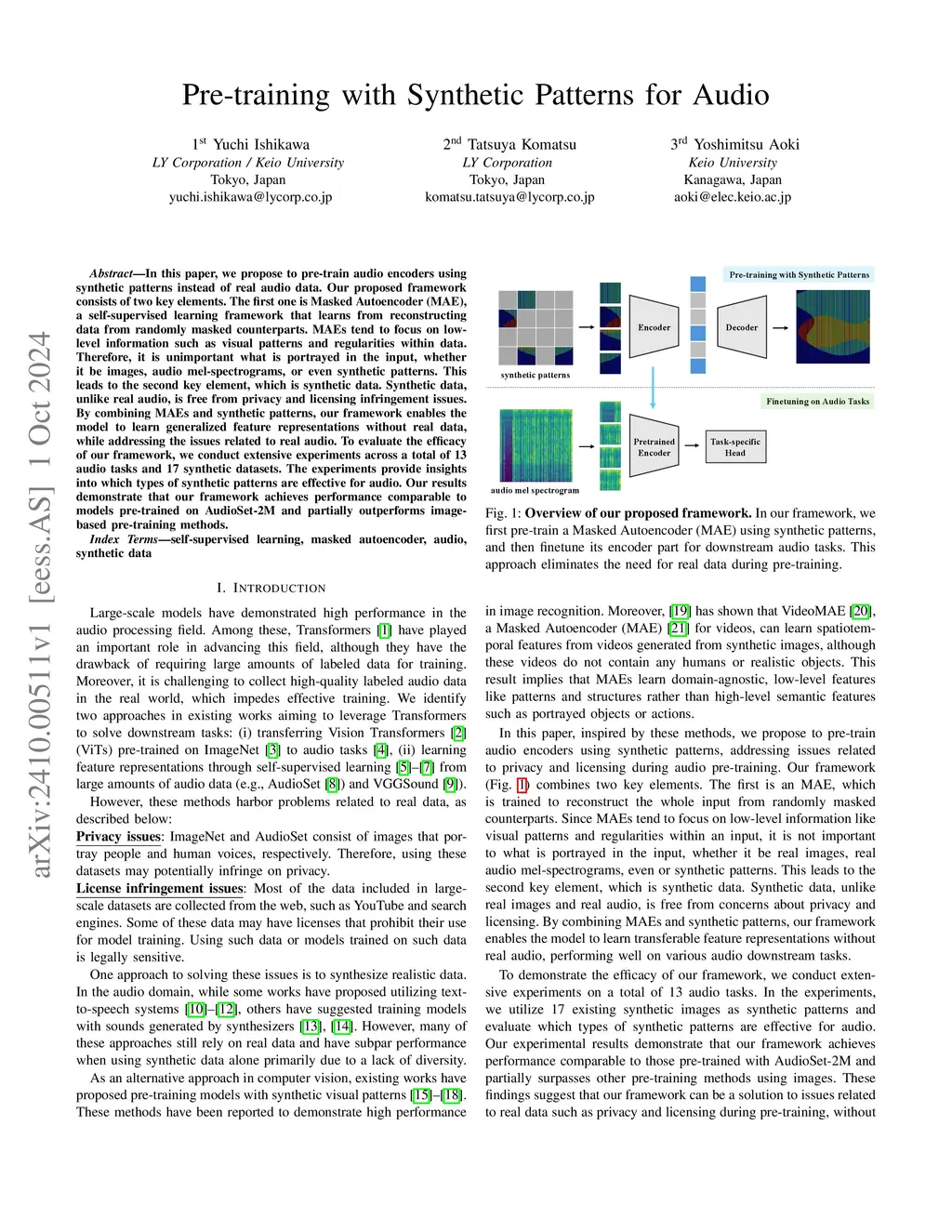 In this paper, we propose to pre-train audio encoders using synthetic patterns instead of real audio data. Our proposed framework consists of two key elements. The first one is Masked Autoencoder (MAE), a self-supervised learning framework that learns from reconstructing data from randomly masked counterparts. MAEs tend to focus on low-level information such as visual patterns and regularities within data. Therefore, it is unimportant what is portrayed in the input, whether it be images, audio mel-spectrograms, or even synthetic patterns. This leads to the second key element, which is synthetic data. Synthetic data, unlike real audio, is free from privacy and licensing infringement issues. By combining MAEs and synthetic patterns, our framework enables the model to learn generalized feature representations without real data, while addressing the issues related to real audio. To evaluate the efficacy of our framework, we conduct extensive experiments across a total of 13 audio tasks and 17 synthetic datasets. The experiments provide insights into which types of synthetic patterns are effective for audio. Our results demonstrate that our framework achieves performance comparable to models pre-trained on AudioSet-2M and partially outperforms image-based pre-training methods.