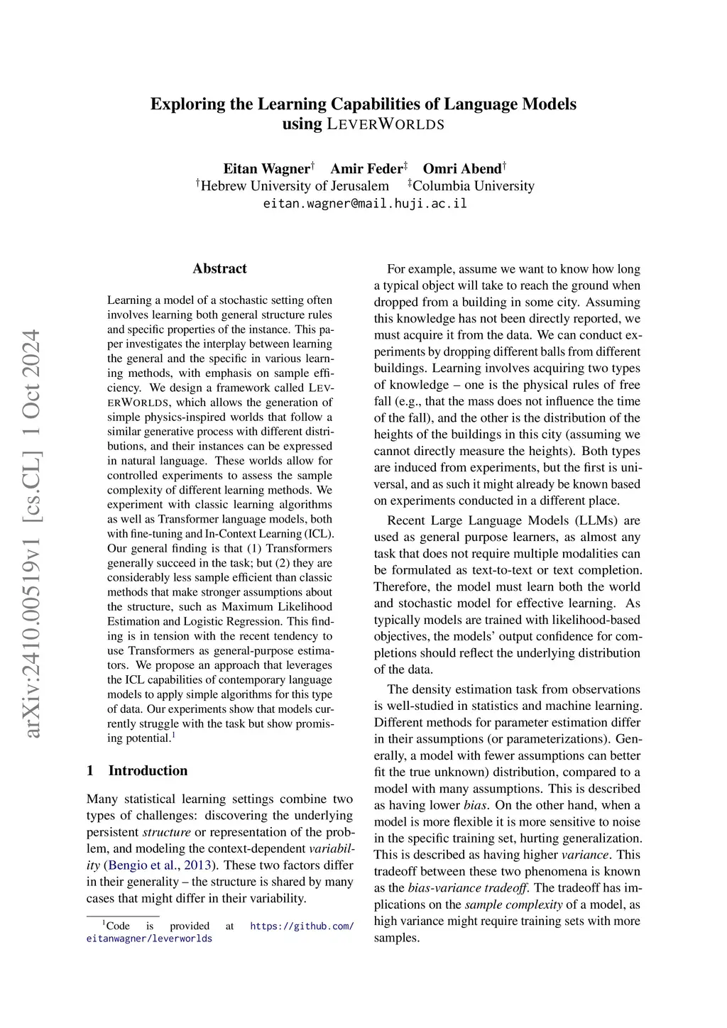 Learning a model of a stochastic setting often involves learning both general structure rules and specific properties of the instance. This paper investigates the interplay between learning the general and the specific in various learning methods, with emphasis on sample efficiency. We design a framework called {\sc LeverWorlds}, which allows the generation of simple physics-inspired worlds that follow a similar generative process with different distributions, and their instances can be expressed in natural language. These worlds allow for controlled experiments to assess the sample complexity of different learning methods. We experiment with classic learning algorithms as well as Transformer language models, both with fine-tuning and In-Context Learning (ICL). Our general finding is that (1) Transformers generally succeed in the task; but (2) they are considerably less sample efficient than classic methods that make stronger assumptions about the structure, such as Maximum Likelihood Estimation and Logistic Regression. This finding is in tension with the recent tendency to use Transformers as general-purpose estimators. We propose an approach that leverages the ICL capabilities of contemporary language models to apply simple algorithms for this type of data. Our experiments show that models currently struggle with the task but show promising potential.