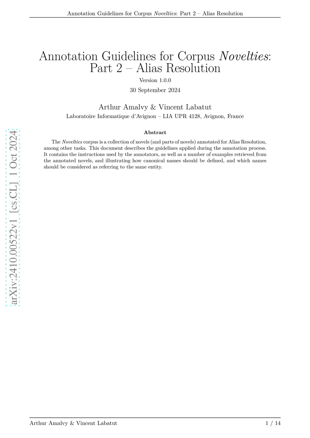 The Novelties corpus is a collection of novels (and parts of novels) annotated for Alias Resolution, among other tasks. This document describes the guidelines applied during the annotation process. It contains the instructions used by the annotators, as well as a number of examples retrieved from the annotated novels, and illustrating how canonical names should be defined, and which names should be considered as referring to the same entity.