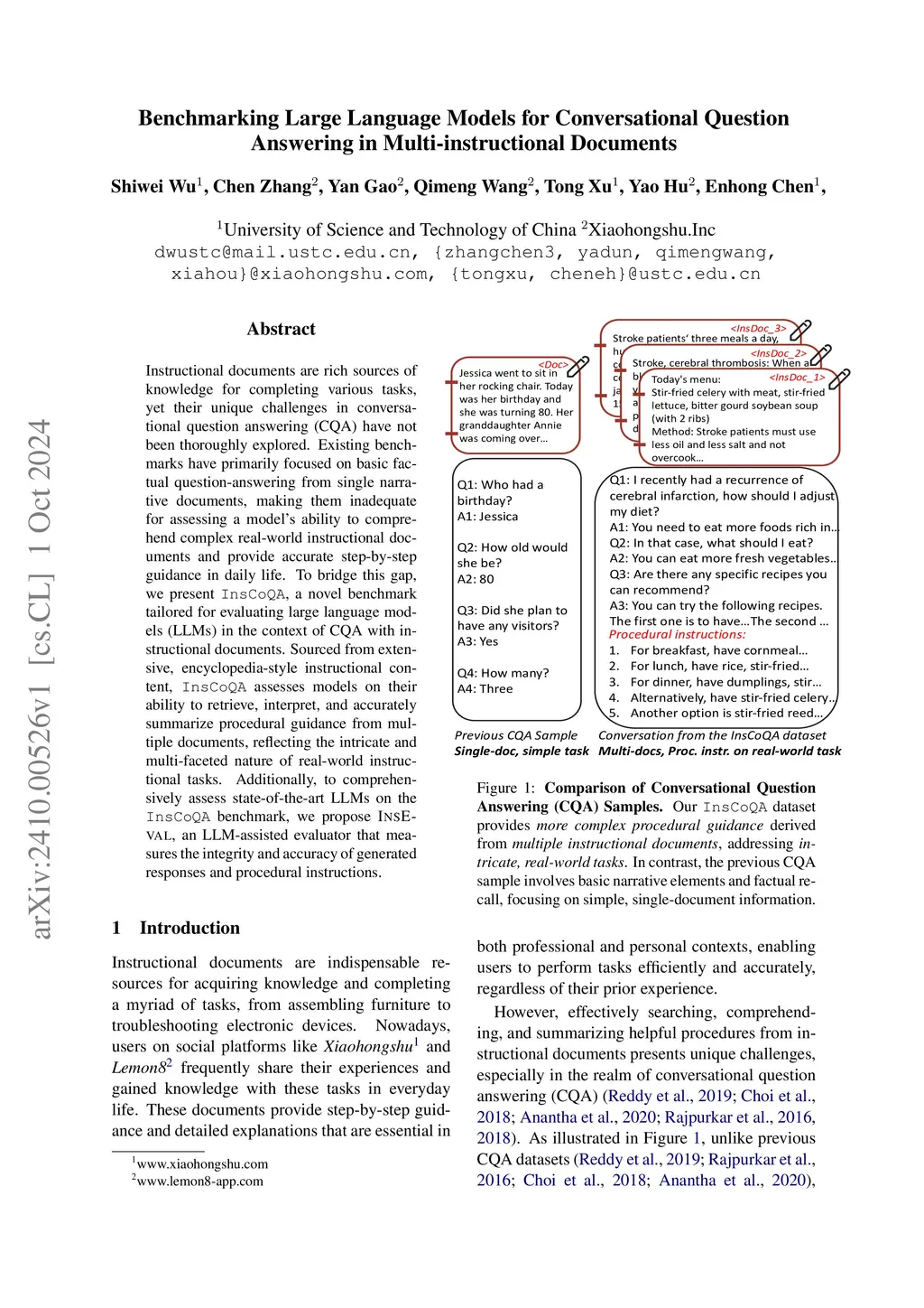 Instructional documents are rich sources of knowledge for completing various tasks, yet their unique challenges in conversational question answering (CQA) have not been thoroughly explored. Existing benchmarks have primarily focused on basic factual question-answering from single narrative documents, making them inadequate for assessing a model`s ability to comprehend complex real-world instructional documents and provide accurate step-by-step guidance in daily life. To bridge this gap, we present InsCoQA, a novel benchmark tailored for evaluating large language models (LLMs) in the context of CQA with instructional documents. Sourced from extensive, encyclopedia-style instructional content, InsCoQA assesses models on their ability to retrieve, interpret, and accurately summarize procedural guidance from multiple documents, reflecting the intricate and multi-faceted nature of real-world instructional tasks. Additionally, to comprehensively assess state-of-the-art LLMs on the InsCoQA benchmark, we propose InsEval, an LLM-assisted evaluator that measures the integrity and accuracy of generated responses and procedural instructions.