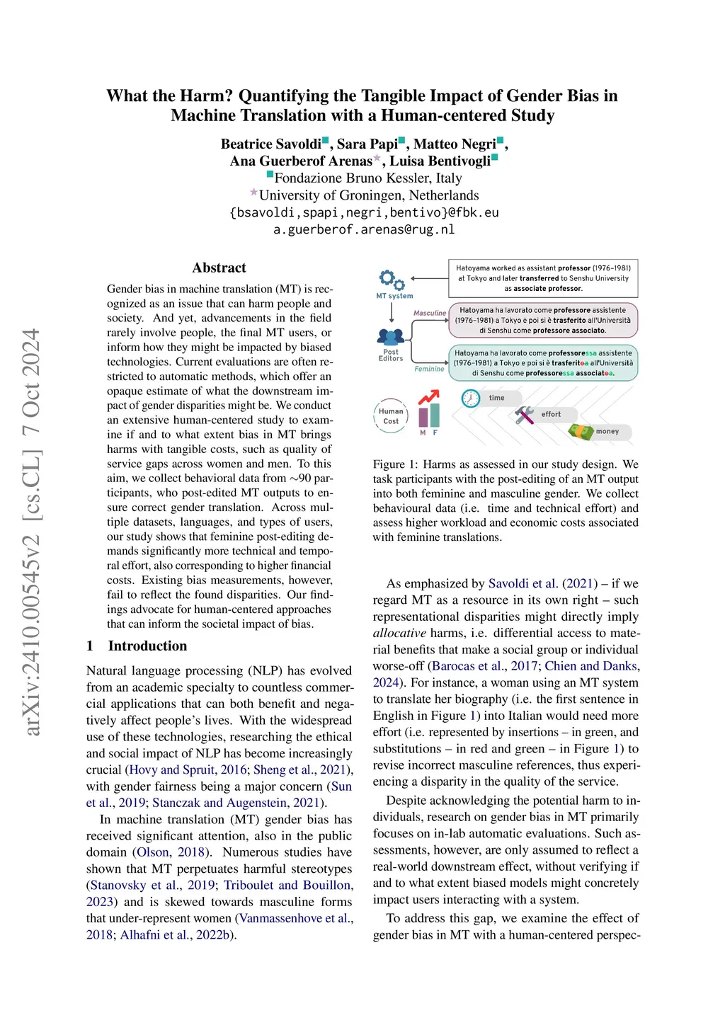 Gender bias in machine translation (MT) is recognized as an issue that can harm people and society. And yet, advancements in the field rarely involve people, the final MT users, or inform how they might be impacted by biased technologies. Current evaluations are often restricted to automatic methods, which offer an opaque estimate of what the downstream impact of gender disparities might be. We conduct an extensive human-centered study to examine if and to what extent bias in MT brings harms with tangible costs, such as quality of service gaps across women and men. To this aim, we collect behavioral data from 90 participants, who post-edited MT outputs to ensure correct gender translation. Across multiple datasets, languages, and types of users, our study shows that feminine post-editing demands significantly more technical and temporal effort, also corresponding to higher financial costs. Existing bias measurements, however, fail to reflect the found disparities. Our findings advocate for human-centered approaches that can inform the societal impact of bias.