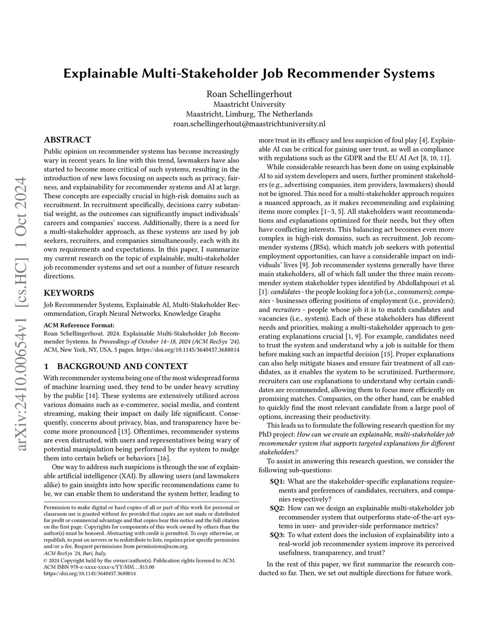 Public opinion on recommender systems has become increasingly wary in recent years. In line with this trend, lawmakers have also started to become more critical of such systems, resulting in the introduction of new laws focusing on aspects such as privacy, fairness, and explainability for recommender systems and AI at large. These concepts are especially crucial in high-risk domains such as recruitment. In recruitment specifically, decisions carry substantial weight, as the outcomes can significantly impact individuals' careers and companies' success. Additionally, there is a need for a multi-stakeholder approach, as these systems are used by job seekers, recruiters, and companies simultaneously, each with its own requirements and expectations. In this paper, I summarize my current research on the topic of explainable, multi-stakeholder job recommender systems and set out a number of future research directions.