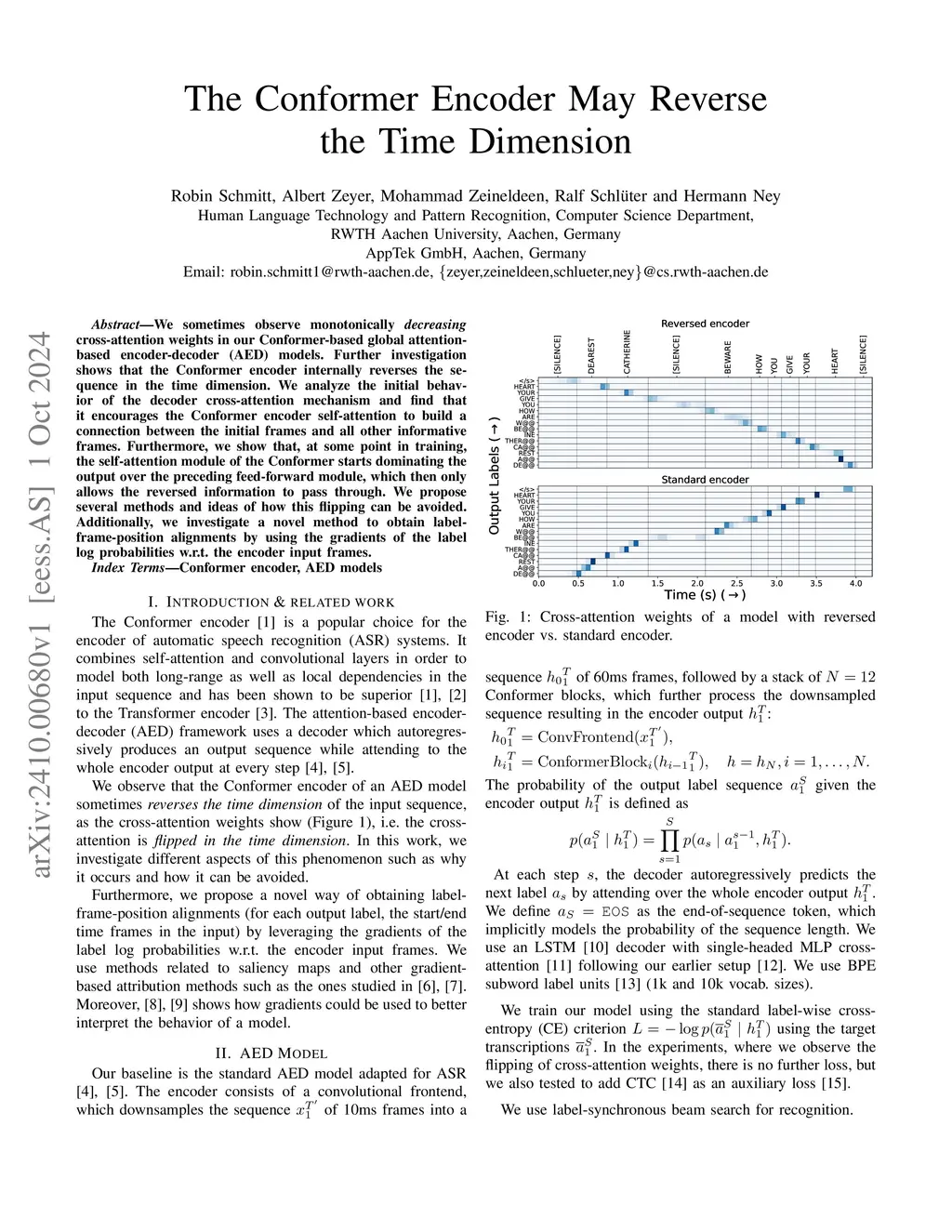 We sometimes observe monotonically decreasing cross-attention weights in our Conformer-based global attention-based encoder-decoder (AED) models, Further investigation shows that the Conformer encoder reverses the sequence in the time dimension. We analyze the initial behavior of the decoder cross-attention mechanism and find that it encourages the Conformer encoder self-attention to build a connection between the initial frames and all other informative frames. Furthermore, we show that, at some point in training, the self-attention module of the Conformer starts dominating the output over the preceding feed-forward module, which then only allows the reversed information to pass through. We propose methods and ideas of how this flipping can be avoided and investigate a novel method to obtain label-frame-position alignments by using the gradients of the label log probabilities w.r.t. the encoder input frames.