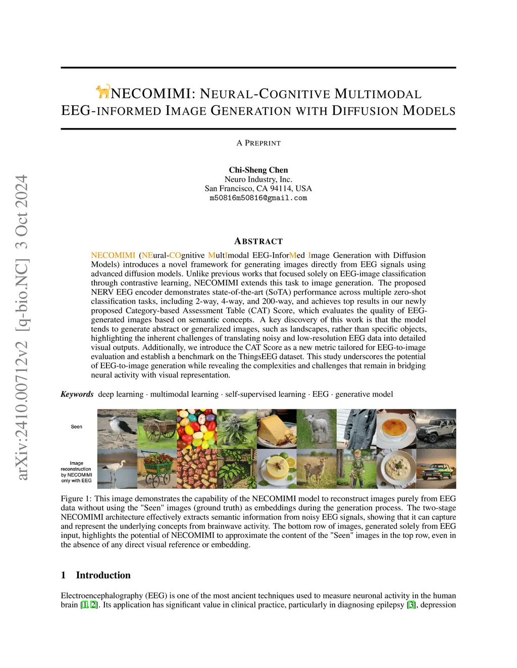 NECOMIMI (NEural-COgnitive MultImodal EEG-Informed Image Generation with Diffusion Models) introduces a novel framework for generating images directly from EEG signals using advanced diffusion models. Unlike previous works that focused solely on EEG-image classification through contrastive learning, NECOMIMI extends this task to image generation. The proposed NERV EEG encoder demonstrates state-of-the-art (SoTA) performance across multiple zero-shot classification tasks, including 2-way, 4-way, and 200-way, and achieves top results in our newly proposed Category-based Assessment Table (CAT) Score, which evaluates the quality of EEG-generated images based on semantic concepts. A key discovery of this work is that the model tends to generate abstract or generalized images, such as landscapes, rather than specific objects, highlighting the inherent challenges of translating noisy and low-resolution EEG data into detailed visual outputs. Additionally, we introduce the CAT Score as a new metric tailored for EEG-to-image evaluation and establish a benchmark on the ThingsEEG dataset. This study underscores the potential of EEG-to-image generation while revealing the complexities and challenges that remain in bridging neural activity with visual representation.