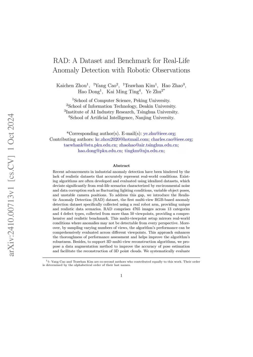 Recent advancements in industrial anomaly detection have been hindered by the lack of realistic datasets that accurately represent real-world conditions. Existing algorithms are often developed and evaluated using idealized datasets, which deviate significantly from real-life scenarios characterized by environmental noise and data corruption such as fluctuating lighting conditions, variable object poses, and unstable camera positions. To address this gap, we introduce the Realistic Anomaly Detection (RAD) dataset, the first multi-view RGB-based anomaly detection dataset specifically collected using a real robot arm, providing unique and realistic data scenarios. RAD comprises 4765 images across 13 categories and 4 defect types, collected from more than 50 viewpoints, providing a comprehensive and realistic benchmark. This multi-viewpoint setup mirrors real-world conditions where anomalies may not be detectable from every perspective. Moreover, by sampling varying numbers of views, the algorithm's performance can be comprehensively evaluated across different viewpoints. This approach enhances the thoroughness of performance assessment and helps improve the algorithm's robustness. Besides, to support 3D multi-view reconstruction algorithms, we propose a data augmentation method to improve the accuracy of pose estimation and facilitate the reconstruction of 3D point clouds. We systematically evaluate state-of-the-art RGB-based and point cloud-based models using RAD, identifying limitations and future research directions. The code and dataset could found at https://github.com/kaichen-z/RAD