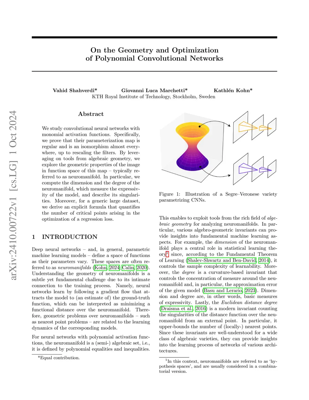 We study convolutional neural networks with monomial activation functions. Specifically, we prove that their parameterization map is regular and is an isomorphism almost everywhere, up to rescaling the filters. By leveraging on tools from algebraic geometry, we explore the geometric properties of the image in function space of this map - typically referred to as neuromanifold. In particular, we compute the dimension and the degree of the neuromanifold, which measure the expressivity of the model, and describe its singularities. Moreover, for a generic large dataset, we derive an explicit formula that quantifies the number of critical points arising in the optimization of a regression loss.