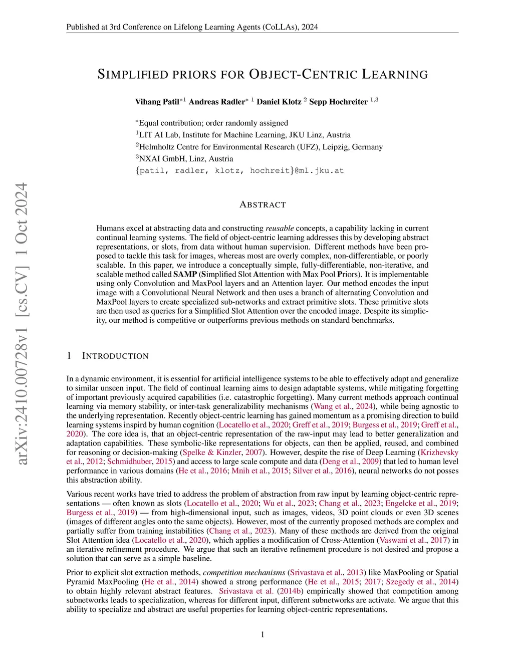 Humans excel at abstracting data and constructing \emph{reusable} concepts, a capability lacking in current continual learning systems. The field of object-centric learning addresses this by developing abstract representations, or slots, from data without human supervision. Different methods have been proposed to tackle this task for images, whereas most are overly complex, non-differentiable, or poorly scalable. In this paper, we introduce a conceptually simple, fully-differentiable, non-iterative, and scalable method called SAMP Simplified Slot Attention with Max Pool Priors). It is implementable using only Convolution and MaxPool layers and an Attention layer. Our method encodes the input image with a Convolutional Neural Network and then uses a branch of alternating Convolution and MaxPool layers to create specialized sub-networks and extract primitive slots. These primitive slots are then used as queries for a Simplified Slot Attention over the encoded image. Despite its simplicity, our method is competitive or outperforms previous methods on standard benchmarks.
