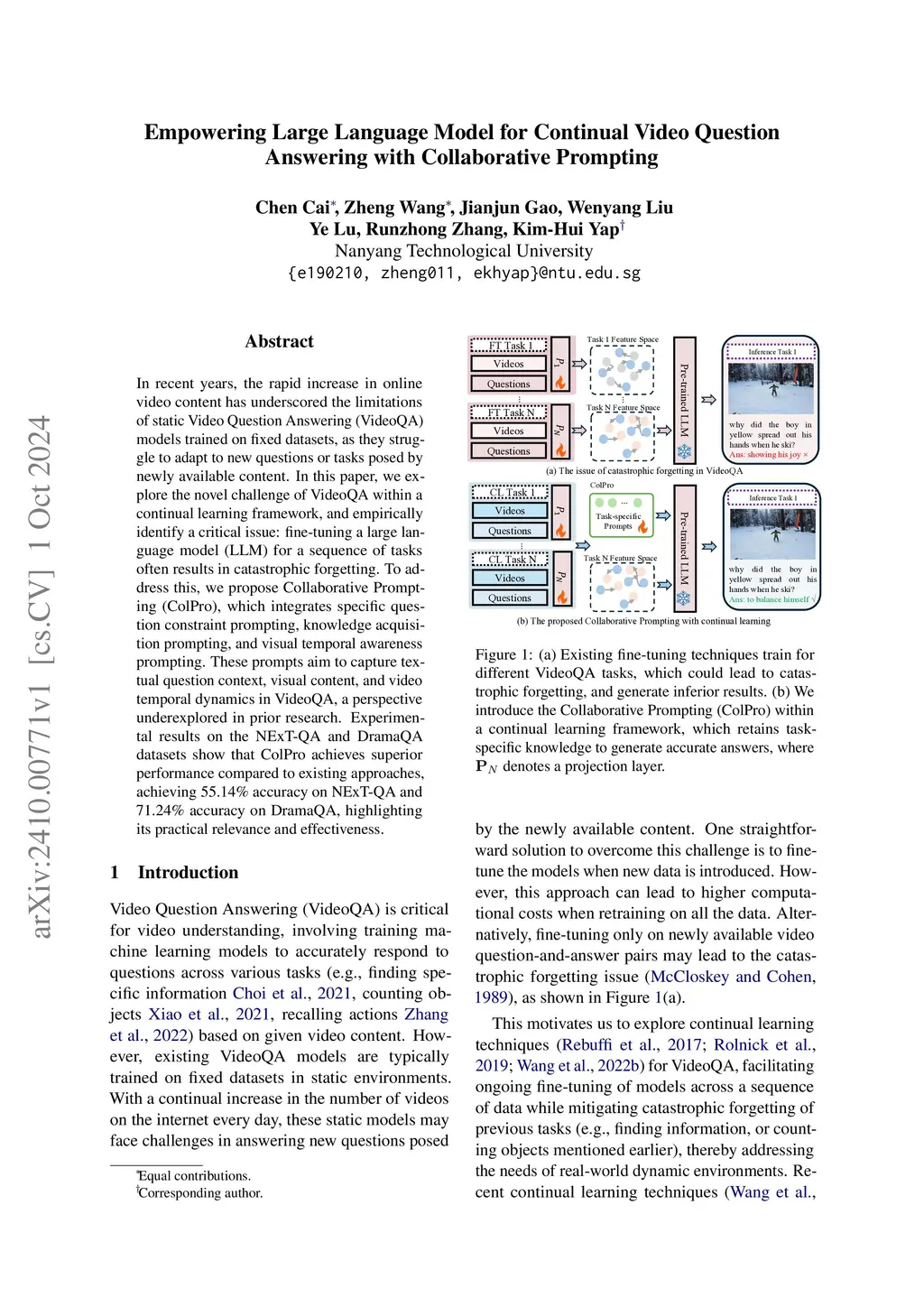 In recent years, the rapid increase in online video content has underscored the limitations of static Video Question Answering (VideoQA) models trained on fixed datasets, as they struggle to adapt to new questions or tasks posed by newly available content. In this paper, we explore the novel challenge of VideoQA within a continual learning framework, and empirically identify a critical issue: fine-tuning a large language model (LLM) for a sequence of tasks often results in catastrophic forgetting. To address this, we propose Collaborative Prompting (ColPro), which integrates specific question constraint prompting, knowledge acquisition prompting, and visual temporal awareness prompting. These prompts aim to capture textual question context, visual content, and video temporal dynamics in VideoQA, a perspective underexplored in prior research. Experimental results on the NExT-QA and DramaQA datasets show that ColPro achieves superior performance compared to existing approaches, achieving 55.14\% accuracy on NExT-QA and 71.24\% accuracy on DramaQA, highlighting its practical relevance and effectiveness.