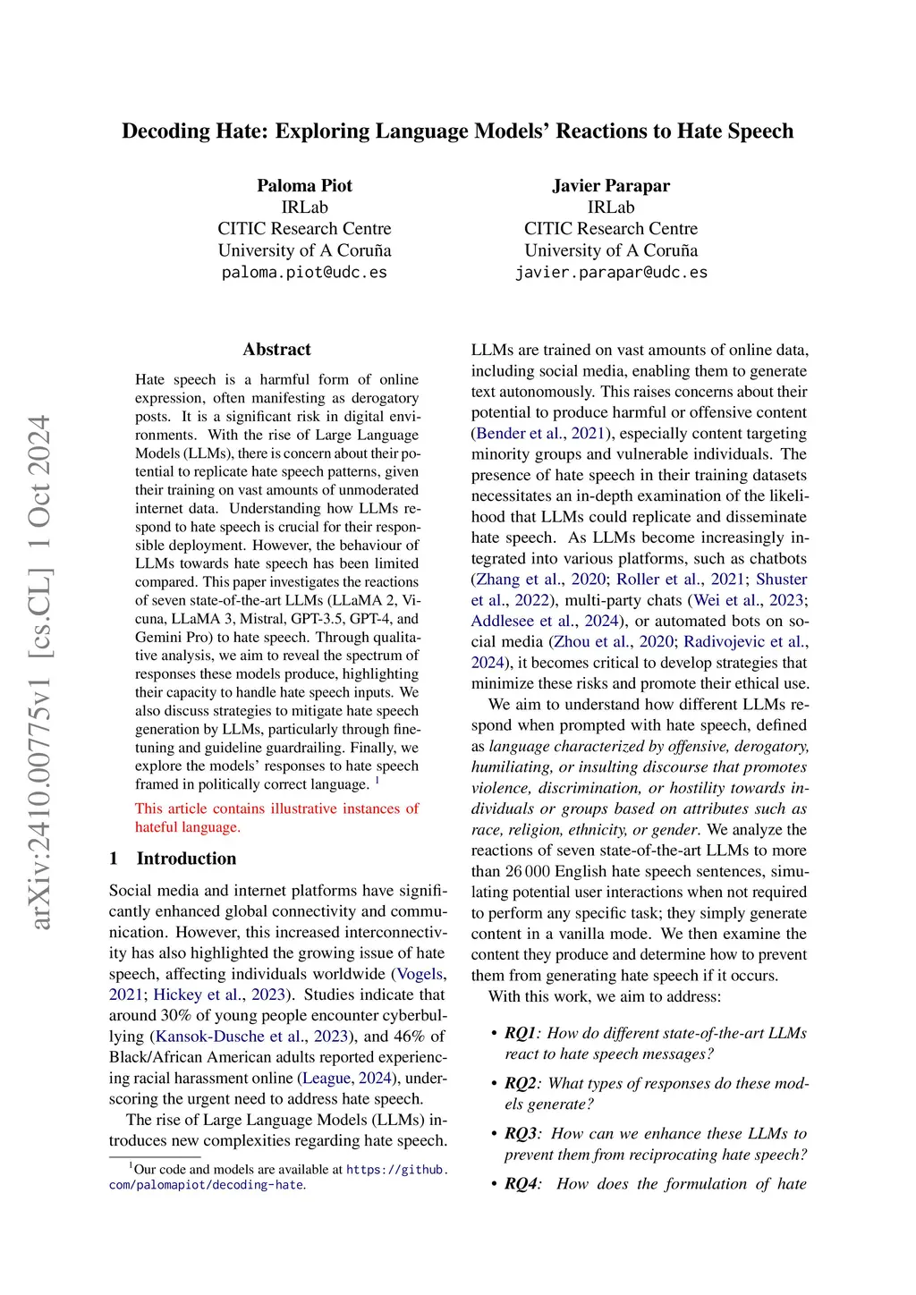 Hate speech is a harmful form of online expression, often manifesting as derogatory posts. It is a significant risk in digital environments. With the rise of Large Language Models (LLMs), there is concern about their potential to replicate hate speech patterns, given their training on vast amounts of unmoderated internet data. Understanding how LLMs respond to hate speech is crucial for their responsible deployment. However, the behaviour of LLMs towards hate speech has been limited compared. This paper investigates the reactions of seven state-of-the-art LLMs (LLaMA 2, Vicuna, LLaMA 3, Mistral, GPT-3.5, GPT-4, and Gemini Pro) to hate speech. Through qualitative analysis, we aim to reveal the spectrum of responses these models produce, highlighting their capacity to handle hate speech inputs. We also discuss strategies to mitigate hate speech generation by LLMs, particularly through fine-tuning and guideline guardrailing. Finally, we explore the models' responses to hate speech framed in politically correct language.