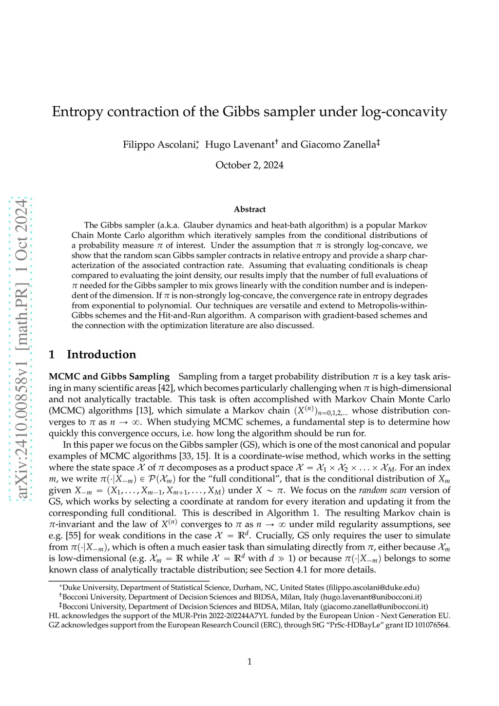 The Gibbs sampler (a.k.a. Glauber dynamics and heat-bath algorithm) is a popular Markov Chain Monte Carlo algorithm which iteratively samples from the conditional distributions of a probability measure of interest. Under the assumption that is strongly log-concave, we show that the random scan Gibbs sampler contracts in relative entropy and provide a sharp characterization of the associated contraction rate. Assuming that evaluating conditionals is cheap compared to evaluating the joint density, our results imply that the number of full evaluations of needed for the Gibbs sampler to mix grows linearly with the condition number and is independent of the dimension. If is non-strongly log-concave, the convergence rate in entropy degrades from exponential to polynomial. Our techniques are versatile and extend to Metropolis-within-Gibbs schemes and the Hit-and-Run algorithm. A comparison with gradient-based schemes and the connection with the optimization literature are also discussed.