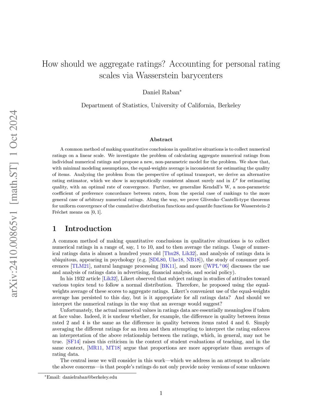 A common method of making quantitative conclusions in qualitative situations is to collect numerical ratings on a linear scale. We investigate the problem of calculating aggregate numerical ratings from individual numerical ratings and propose a new, non-parametric model for the problem. We show that, with minimal modeling assumptions, the equal-weights average is inconsistent for estimating the quality of items. Analyzing the problem from the perspective of optimal transport, we derive an alternative rating estimator, which we show is asymptotically consistent almost surely and in for estimating quality, with an optimal rate of convergence. Further, we generalize Kendall's W, a non-parametric coefficient of preference concordance between raters, from the special case of rankings to the more general case of arbitrary numerical ratings. Along the way, we prove Glivenko--Cantelli-type theorems for uniform convergence of the cumulative distribution functions and quantile functions for Wasserstein-2 Fr\échet means on [0,1].