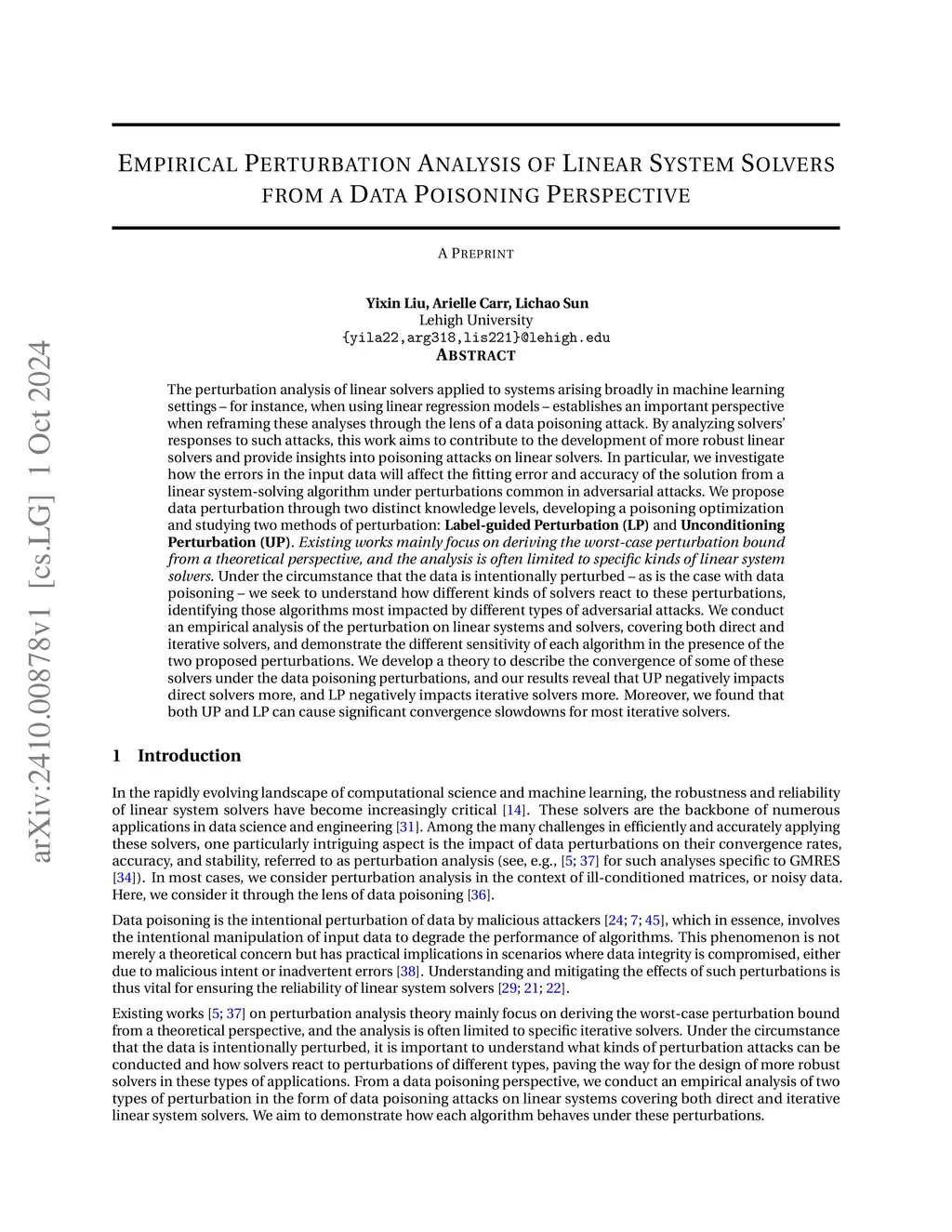 The perturbation analysis of linear solvers applied to systems arising broadly in machine learning settings -- for instance, when using linear regression models -- establishes an important perspective when reframing these analyses through the lens of a data poisoning attack. By analyzing solvers' responses to such attacks, this work aims to contribute to the development of more robust linear solvers and provide insights into poisoning attacks on linear solvers. In particular, we investigate how the errors in the input data will affect the fitting error and accuracy of the solution from a linear system-solving algorithm under perturbations common in adversarial attacks. We propose data perturbation through two distinct knowledge levels, developing a poisoning optimization and studying two methods of perturbation: Label-guided Perturbation (LP) and Unconditioning Perturbation (UP). Existing works mainly focus on deriving the worst-case perturbation bound from a theoretical perspective, and the analysis is often limited to specific kinds of linear system solvers. Under the circumstance that the data is intentionally perturbed -- as is the case with data poisoning -- we seek to understand how different kinds of solvers react to these perturbations, identifying those algorithms most impacted by different types of adversarial attacks.