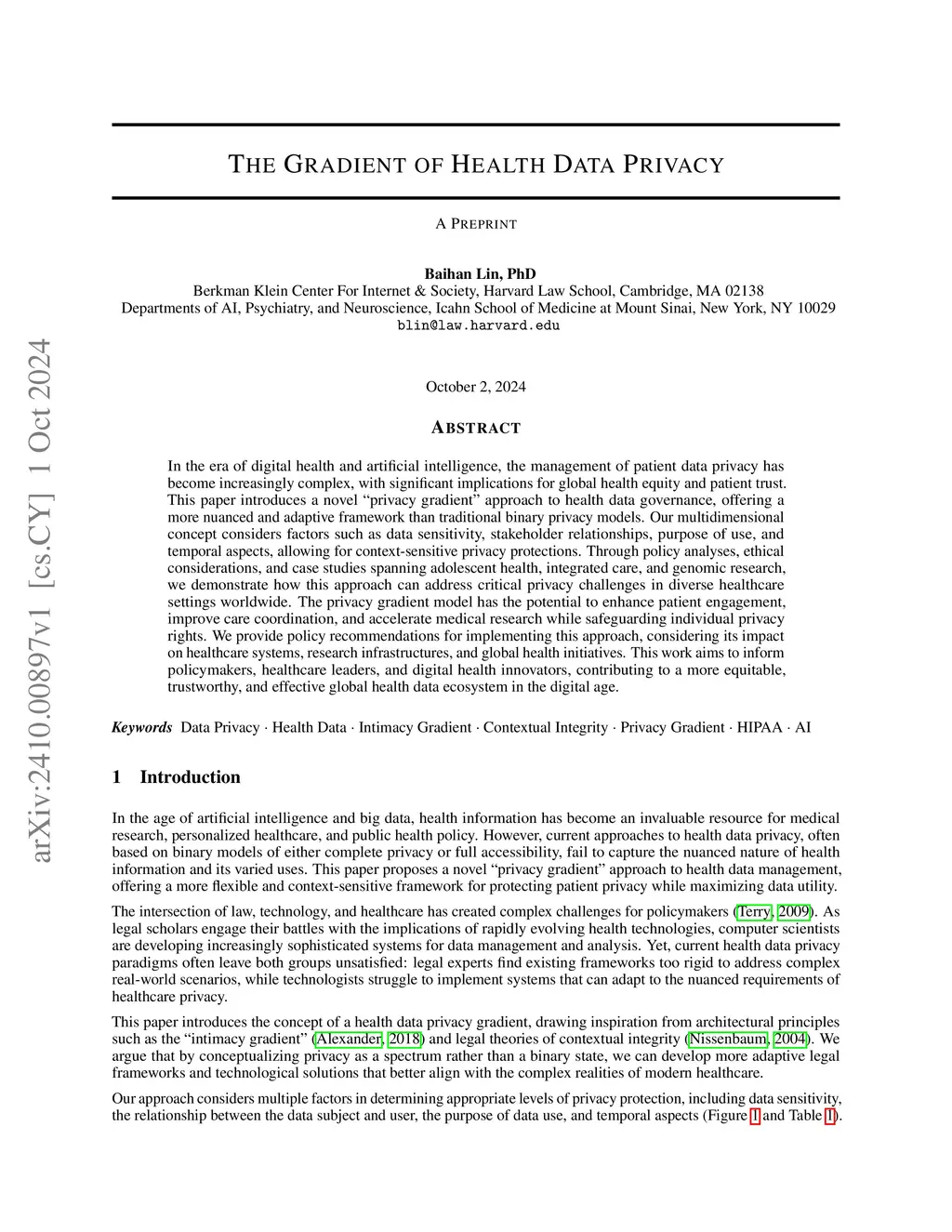 In the era of digital health and artificial intelligence, the management of patient data privacy has become increasingly complex, with significant implications for global health equity and patient trust. This paper introduces a novel "privacy gradient" approach to health data governance, offering a more nuanced and adaptive framework than traditional binary privacy models. Our multidimensional concept considers factors such as data sensitivity, stakeholder relationships, purpose of use, and temporal aspects, allowing for context-sensitive privacy protections. Through policy analyses, ethical considerations, and case studies spanning adolescent health, integrated care, and genomic research, we demonstrate how this approach can address critical privacy challenges in diverse healthcare settings worldwide. The privacy gradient model has the potential to enhance patient engagement, improve care coordination, and accelerate medical research while safeguarding individual privacy rights. We provide policy recommendations for implementing this approach, considering its impact on healthcare systems, research infrastructures, and global health initiatives. This work aims to inform policymakers, healthcare leaders, and digital health innovators, contributing to a more equitable, trustworthy, and effective global health data ecosystem in the digital age.