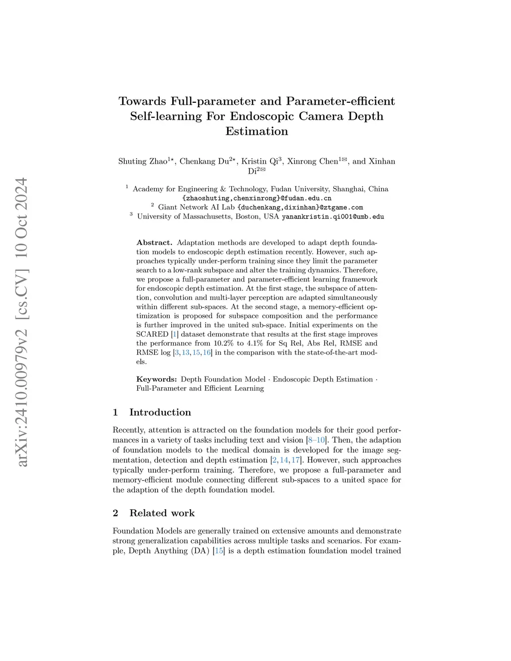 Adaptation methods are developed to adapt depth foundation models to endoscopic depth estimation recently. However, such approaches typically under-perform training since they limit the parameter search to a low-rank subspace and alter the training dynamics. Therefore, we propose a full-parameter and parameter-efficient learning framework for endoscopic depth estimation. At the first stage, the subspace of attention, convolution and multi-layer perception are adapted simultaneously within different sub-spaces. At the second stage, a memory-efficient optimization is proposed for subspace composition and the performance is further improved in the united sub-space. Initial experiments on the SCARED dataset demonstrate that results at the first stage improves the performance from 10.2% to 4.1% for Sq Rel, Abs Rel, RMSE and RMSE log in the comparison with the state-of-the-art models.