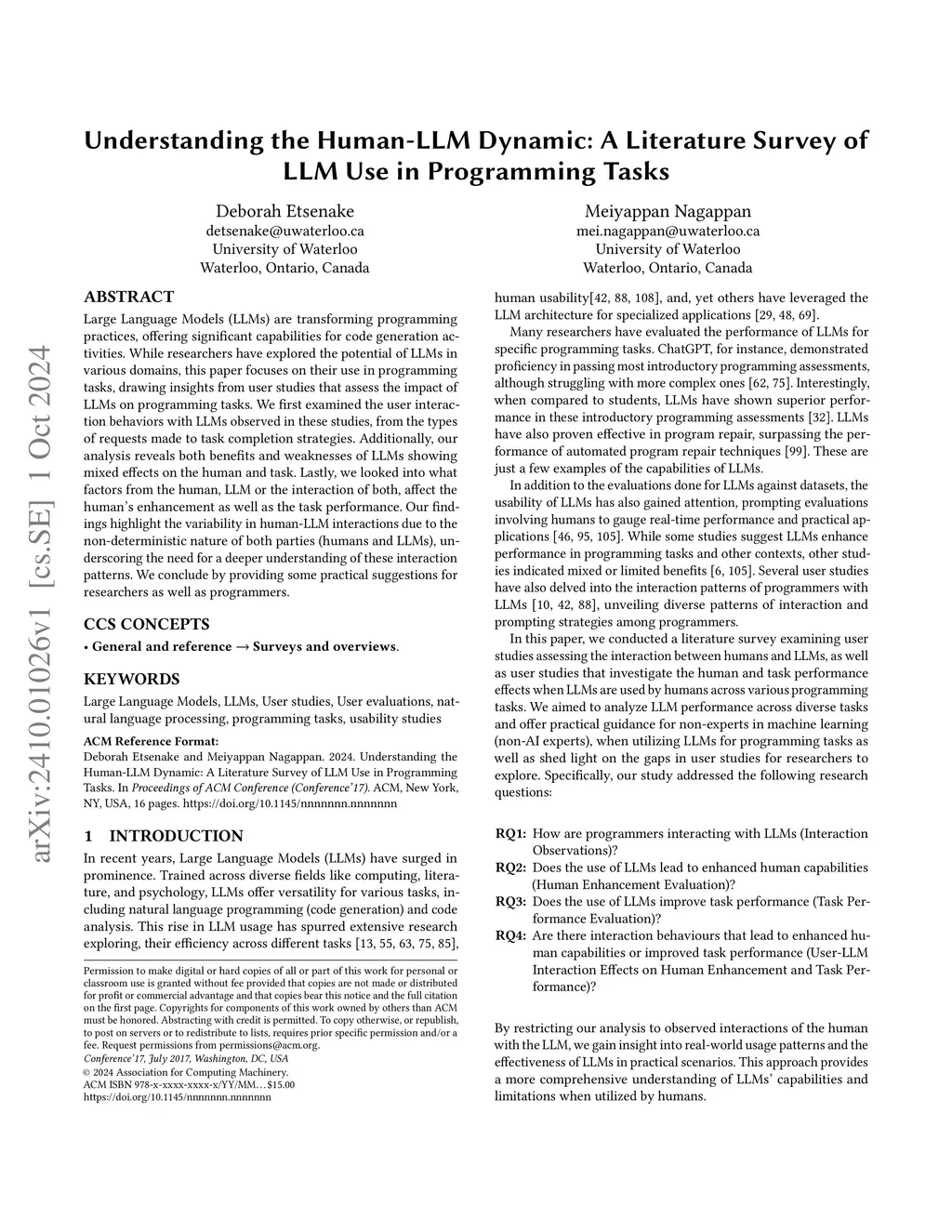 Large Language Models (LLMs) are transforming programming practices, offering significant capabilities for code generation activities. While researchers have explored the potential of LLMs in various domains, this paper focuses on their use in programming tasks, drawing insights from user studies that assess the impact of LLMs on programming tasks. We first examined the user interaction behaviors with LLMs observed in these studies, from the types of requests made to task completion strategies. Additionally, our analysis reveals both benefits and weaknesses of LLMs showing mixed effects on the human and task. Lastly, we looked into what factors from the human, LLM or the interaction of both, affect the human's enhancement as well as the task performance. Our findings highlight the variability in human-LLM interactions due to the non-deterministic nature of both parties (humans and LLMs), underscoring the need for a deeper understanding of these interaction patterns. We conclude by providing some practical suggestions for researchers as well as programmers.