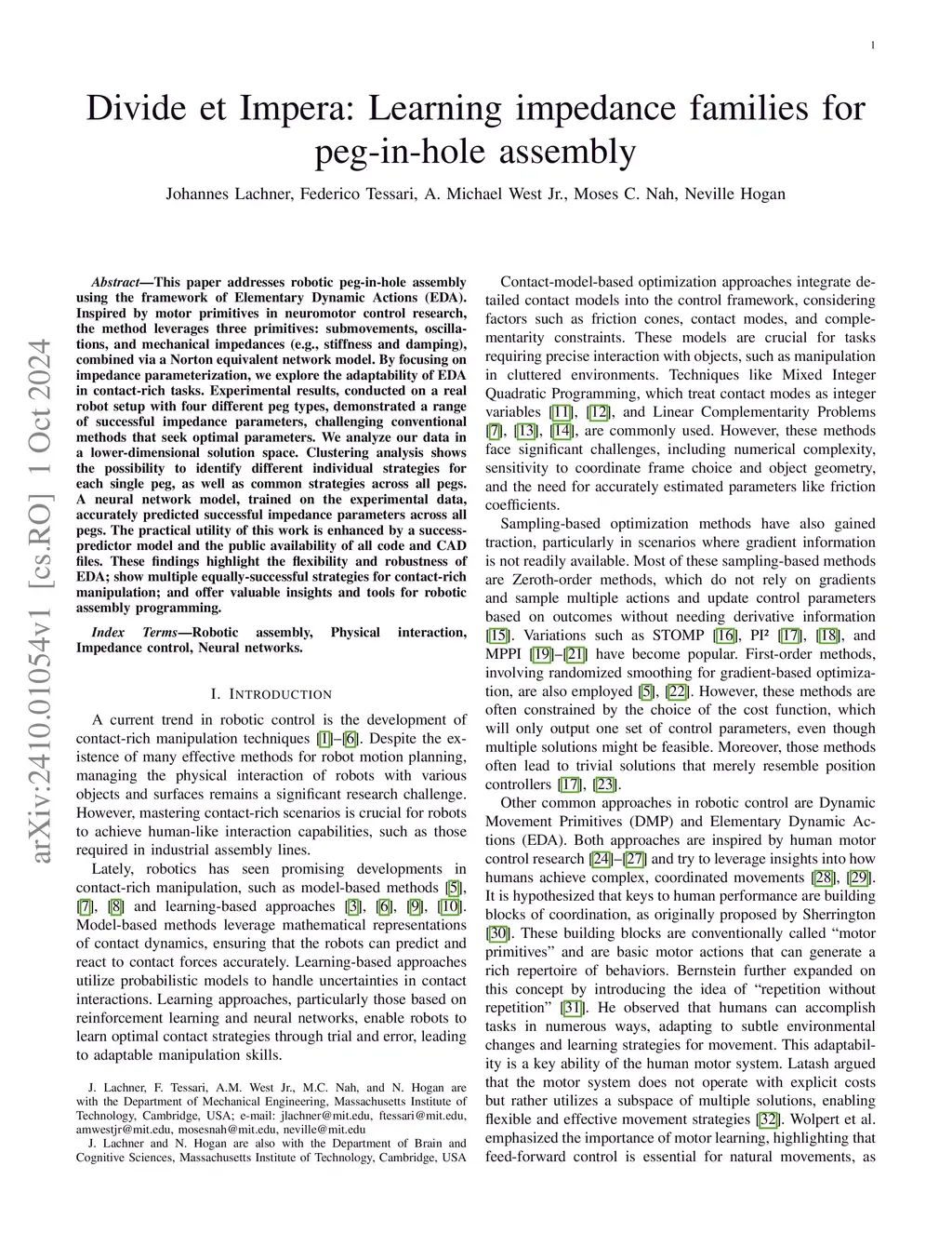 This paper investigates robotic peg-in-hole assembly using the Elementary Dynamic Actions (EDA) framework, which models contact-rich tasks through a combination of submovements, oscillations, and mechanical impedance. Rather than focusing on a single optimal parameter set, we analyze the distribution and structure of multiple successful impedance solutions, revealing patterns that guide impedance selection in contactrich robotic manipulation. Experiments with a real robot and four different peg types demonstrate the presence of task-specific and generalized assembly strategies, identified through K-means Clustering. Principal Component Analysis (PCA) is used to represent these findings, highlighting patterns in successful impedance selections. Additionally, a neural-network-based success predictor accurately estimates feasible impedance parameters, reducing the need for extensive trial-and-error tuning. By providing publicly available code, CAD files, and a trained model, this work enhances the accessibility of impedance control and offers a structured approach to programming robotic assembly tasks, particularly for less-experienced users.