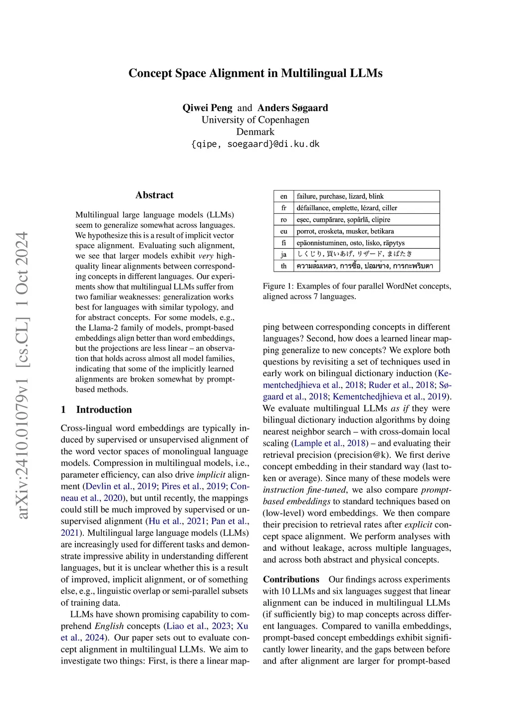 Multilingual large language models (LLMs) seem to generalize somewhat across languages. We hypothesize this is a result of implicit vector space alignment. Evaluating such alignment, we see that larger models exhibit very high-quality linear alignments between corresponding concepts in different languages. Our experiments show that multilingual LLMs suffer from two familiar weaknesses: generalization works best for languages with similar typology, and for abstract concepts. For some models, e.g., the Llama-2 family of models, prompt-based embeddings align better than word embeddings, but the projections are less linear -- an observation that holds across almost all model families, indicating that some of the implicitly learned alignments are broken somewhat by prompt-based methods.
