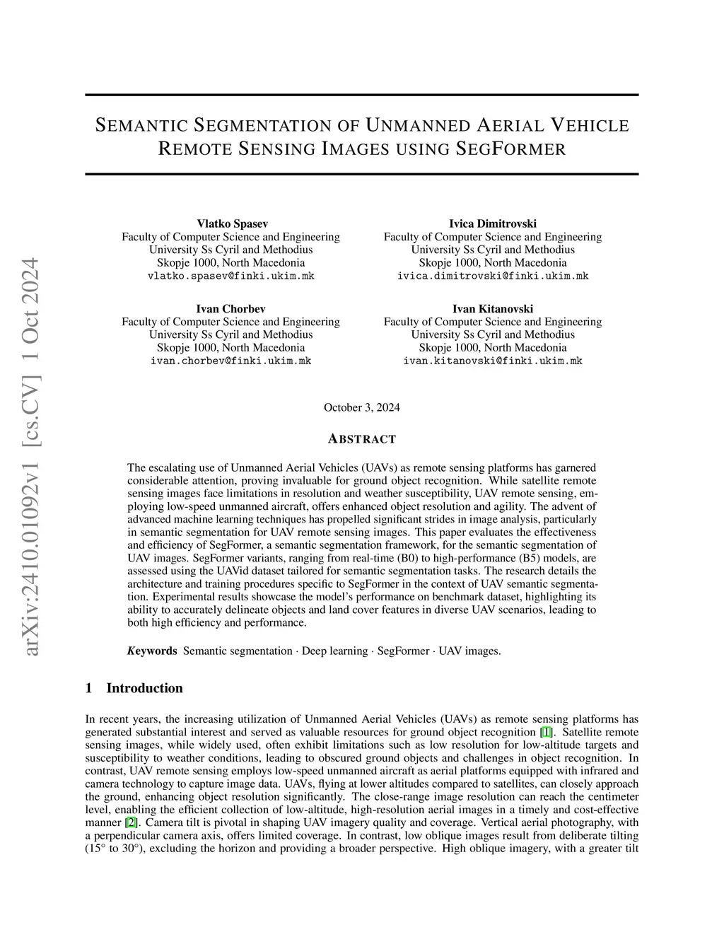 The escalating use of Unmanned Aerial Vehicles (UAVs) as remote sensing platforms has garnered considerable attention, proving invaluable for ground object recognition. While satellite remote sensing images face limitations in resolution and weather susceptibility, UAV remote sensing, employing low-speed unmanned aircraft, offers enhanced object resolution and agility. The advent of advanced machine learning techniques has propelled significant strides in image analysis, particularly in semantic segmentation for UAV remote sensing images. This paper evaluates the effectiveness and efficiency of SegFormer, a semantic segmentation framework, for the semantic segmentation of UAV images. SegFormer variants, ranging from real-time (B0) to high-performance (B5) models, are assessed using the UAVid dataset tailored for semantic segmentation tasks. The research details the architecture and training procedures specific to SegFormer in the context of UAV semantic segmentation. Experimental results showcase the model's performance on benchmark dataset, highlighting its ability to accurately delineate objects and land cover features in diverse UAV scenarios, leading to both high efficiency and performance.