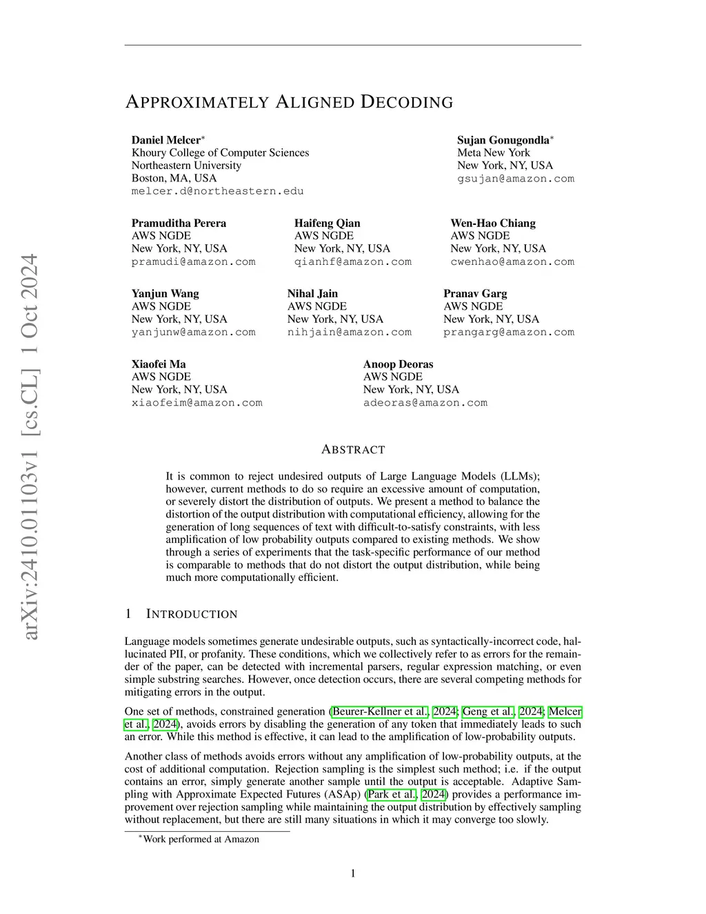 It is common to reject undesired outputs of Large Language Models (LLMs); however, current methods to do so require an excessive amount of computation to re-sample after a rejection, or distort the distribution of outputs by constraining the output to highly improbable tokens. We present a method, Approximately Aligned Decoding (AprAD), to balance the distortion of the output distribution with computational efficiency, inspired by algorithms from the speculative decoding literature. AprAD allows for the generation of long sequences of text with difficult-to-satisfy constraints, while amplifying low probability outputs much less compared to existing methods. We show through a series of experiments that the task-specific performance of AprAD is comparable to methods that do not distort the output distribution, while being much more computationally efficient.