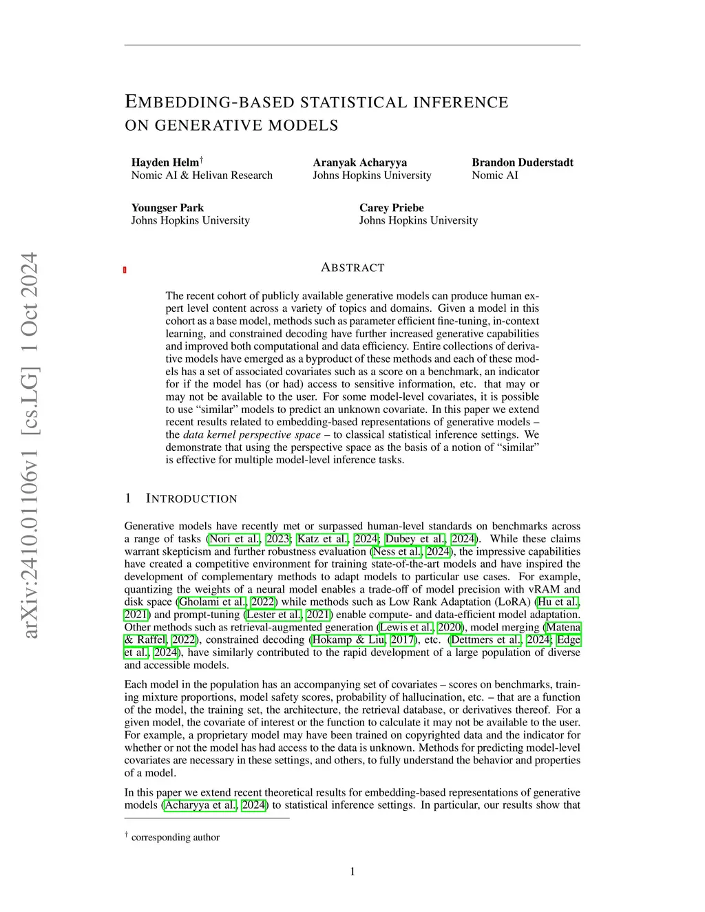 Generative models are capable of producing human-expert level content across a variety of topics and domains. As the impact of generative models grows, it is necessary to develop statistical methods to understand collections of available models. These methods are particularly important in settings where the user may not have access to information related to a model's pre-training data, weights, or other relevant model-level covariates. In this paper we extend recent results on representations of black-box generative models to model-level statistical inference tasks. We demonstrate that the model-level representations are effective for multiple inference tasks.