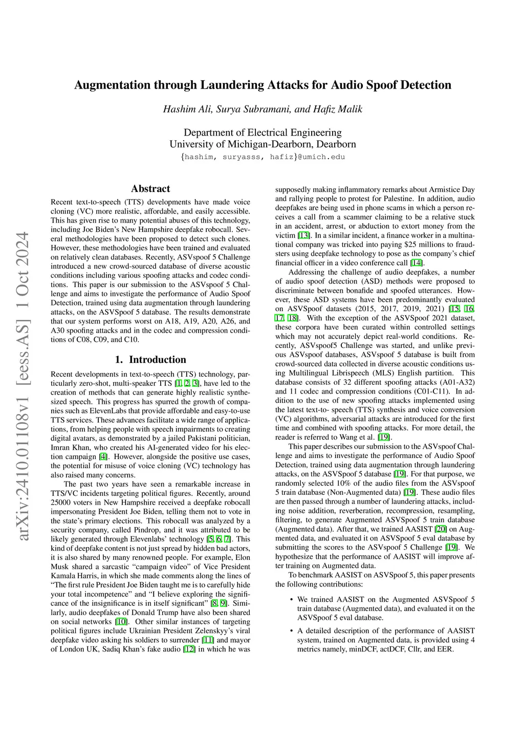 Recent text-to-speech (TTS) developments have made voice cloning (VC) more realistic, affordable, and easily accessible. This has given rise to many potential abuses of this technology, including Joe Biden's New Hampshire deepfake robocall. Several methodologies have been proposed to detect such clones. However, these methodologies have been trained and evaluated on relatively clean databases. Recently, ASVspoof 5 Challenge introduced a new crowd-sourced database of diverse acoustic conditions including various spoofing attacks and codec conditions. This paper is our submission to the ASVspoof 5 Challenge and aims to investigate the performance of Audio Spoof Detection, trained using data augmentation through laundering attacks, on the ASVSpoof 5 database. The results demonstrate that our system performs worst on A18, A19, A20, A26, and A30 spoofing attacks and in the codec and compression conditions of C08, C09, and C10.