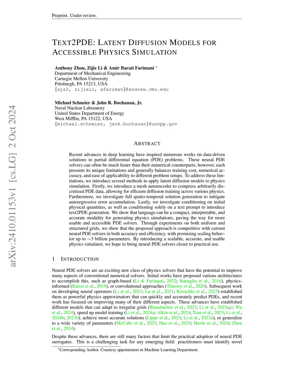 Recent advances in deep learning have inspired numerous works on data-driven solutions to partial differential equation (PDE) problems. These neural PDE solvers can often be much faster than their numerical counterparts; however, each presents its unique limitations and generally balances training cost, numerical accuracy, and ease of applicability to different problem setups. To address these limitations, we introduce several methods to apply latent diffusion models to physics simulation. Firstly, we introduce a mesh autoencoder to compress arbitrarily discretized PDE data, allowing for efficient diffusion training across various physics. Furthermore, we investigate full spatio-temporal solution generation to mitigate autoregressive error accumulation. Lastly, we investigate conditioning on initial physical quantities, as well as conditioning solely on a text prompt to introduce text2PDE generation. We show that language can be a compact, interpretable, and accurate modality for generating physics simulations, paving the way for more usable and accessible PDE solvers. Through experiments on both uniform and structured grids, we show that the proposed approach is competitive with current neural PDE solvers in both accuracy and efficiency, with promising scaling behavior up to 3 billion parameters. By introducing a scalable, accurate, and usable physics simulator, we hope to bring neural PDE solvers closer to practical use.
