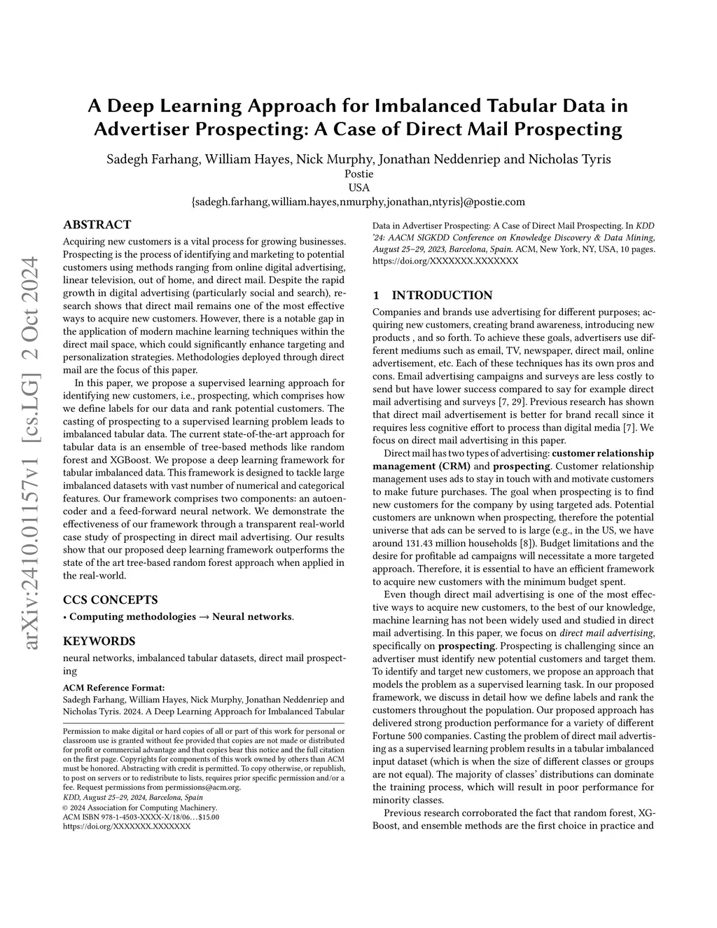 Acquiring new customers is a vital process for growing businesses. Prospecting is the process of identifying and marketing to potential customers using methods ranging from online digital advertising, linear television, out of home, and direct mail. Despite the rapid growth in digital advertising (particularly social and search), research shows that direct mail remains one of the most effective ways to acquire new customers. However, there is a notable gap in the application of modern machine learning techniques within the direct mail space, which could significantly enhance targeting and personalization strategies. Methodologies deployed through direct mail are the focus of this paper. In this paper, we propose a supervised learning approach for identifying new customers, i.e., prospecting, which comprises how we define labels for our data and rank potential customers. The casting of prospecting to a supervised learning problem leads to imbalanced tabular data. The current state-of-the-art approach for tabular data is an ensemble of tree-based methods like random forest and XGBoost. We propose a deep learning framework for tabular imbalanced data. This framework is designed to tackle large imbalanced datasets with vast number of numerical and categorical features. Our framework comprises two components: an autoencoder and a feed-forward neural network. We demonstrate the effectiveness of our framework through a transparent real-world case study of prospecting in direct mail advertising. Our results show that our proposed deep learning framework outperforms the state of the art tree-based random forest approach when applied in the real-world.
