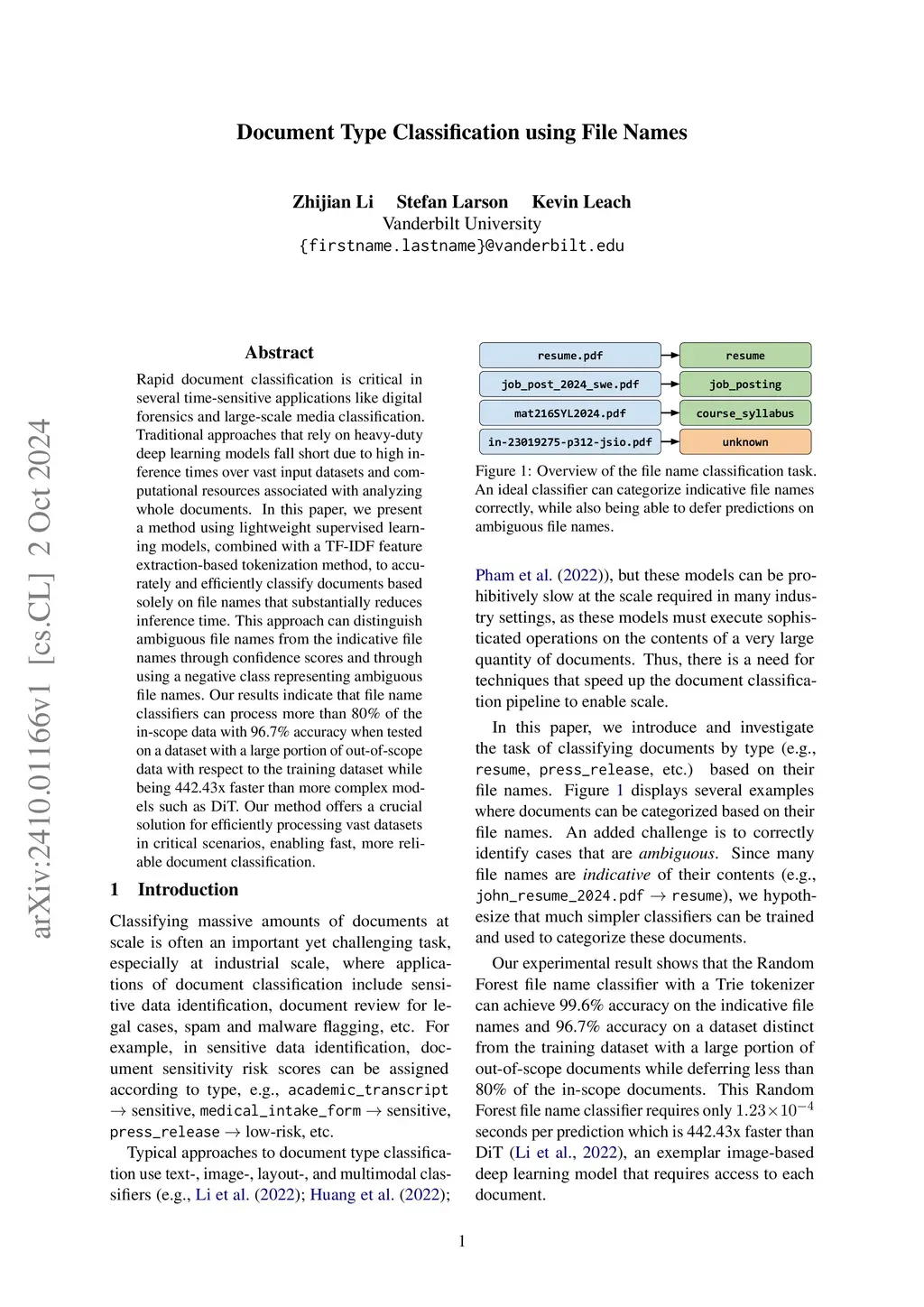 Rapid document classification is critical in several time-sensitive applications like digital forensics and large-scale media classification. Traditional approaches that rely on heavy-duty deep learning models fall short due to high inference times over vast input datasets and computational resources associated with analyzing whole documents. In this paper, we present a method using lightweight supervised learning models, combined with a TF-IDF feature extraction-based tokenization method, to accurately and efficiently classify documents based solely on file names, that substantially reduces inference time. Our results indicate that file name classifiers can process more than 90% of in-scope documents with 99.63% and 96.57% accuracy when tested on two datasets, while being 442x faster than more complex models such as DiT. Our method offers a crucial solution to efficiently process vast document datasets in critical scenarios, enabling fast and more reliable document classification.