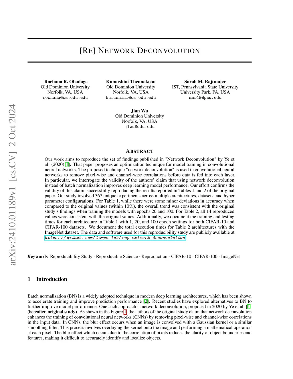 Our work aims to reproduce the set of findings published in "Network Deconvolution" by Ye et al. (2020)[1]. That paper proposes an optimization technique for model training in convolutional neural networks. The proposed technique "network deconvolution" is used in convolutional neural networks to remove pixel-wise and channel-wise correlations before data is fed into each layer. In particular, we interrogate the validity of the authors' claim that using network deconvolution instead of batch normalization improves deep learning model performance. Our effort confirms the validity of this claim, successfully reproducing the results reported in Tables 1 and 2 of the original paper. Our study involved 367 unique experiments across multiple architectures, datasets, and hyper parameter configurations. For Table 1, while there were some minor deviations in accuracy when compared to the original values (within 10%), the overall trend was consistent with the original study's findings when training the models with epochs 20 and 100. For Table 2, all 14 reproduced values were consistent with the original values. Additionally, we document the training and testing times for each architecture in Table 1 with 1, 20, and 100 epoch settings for both CIFAR-10 and CIFAR-100 datasets. We document the total execution times for Table 2 architectures with the ImageNet dataset. The data and software used for this reproducibility study are publicly available at https://github.com/lamps-lab/rep-network-deconvolution.