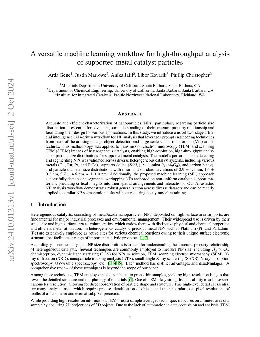 Accurate and efficient characterization of nanoparticles (NPs), particularly regarding particle size distribution, is essential for advancing our understanding of their structure-property relationships and facilitating their design for various applications. In this study, we introduce a novel two-stage artificial intelligence (AI)-driven workflow for NP analysis that leverages prompt engineering techniques from state-of-the-art single-stage object detection and large-scale vision transformer (ViT) architectures. This methodology was applied to transmission electron microscopy (TEM) and scanning TEM (STEM) images of heterogeneous catalysts, enabling high-resolution, high-throughput analysis of particle size distributions for supported metal catalysts. The model's performance in detecting and segmenting NPs was validated across diverse heterogeneous catalyst systems, including various metals (Cu, Ru, Pt, and PtCo), supports (silica (), -alumina (-), and carbon black), and particle diameter size distributions with means and standard deviations of 2.9 1.1 nm, 1.6 0.2 nm, 9.7 4.6 nm, and 4 1.0 nm. Additionally, the proposed machine learning (ML) approach successfully detects and segments overlapping NPs anchored on non-uniform catalytic support materials, providing critical insights into their spatial arrangements and interactions. Our AI-assisted NP analysis workflow demonstrates robust generalization across diverse datasets and can be readily applied to similar NP segmentation tasks without requiring costly model retraining.