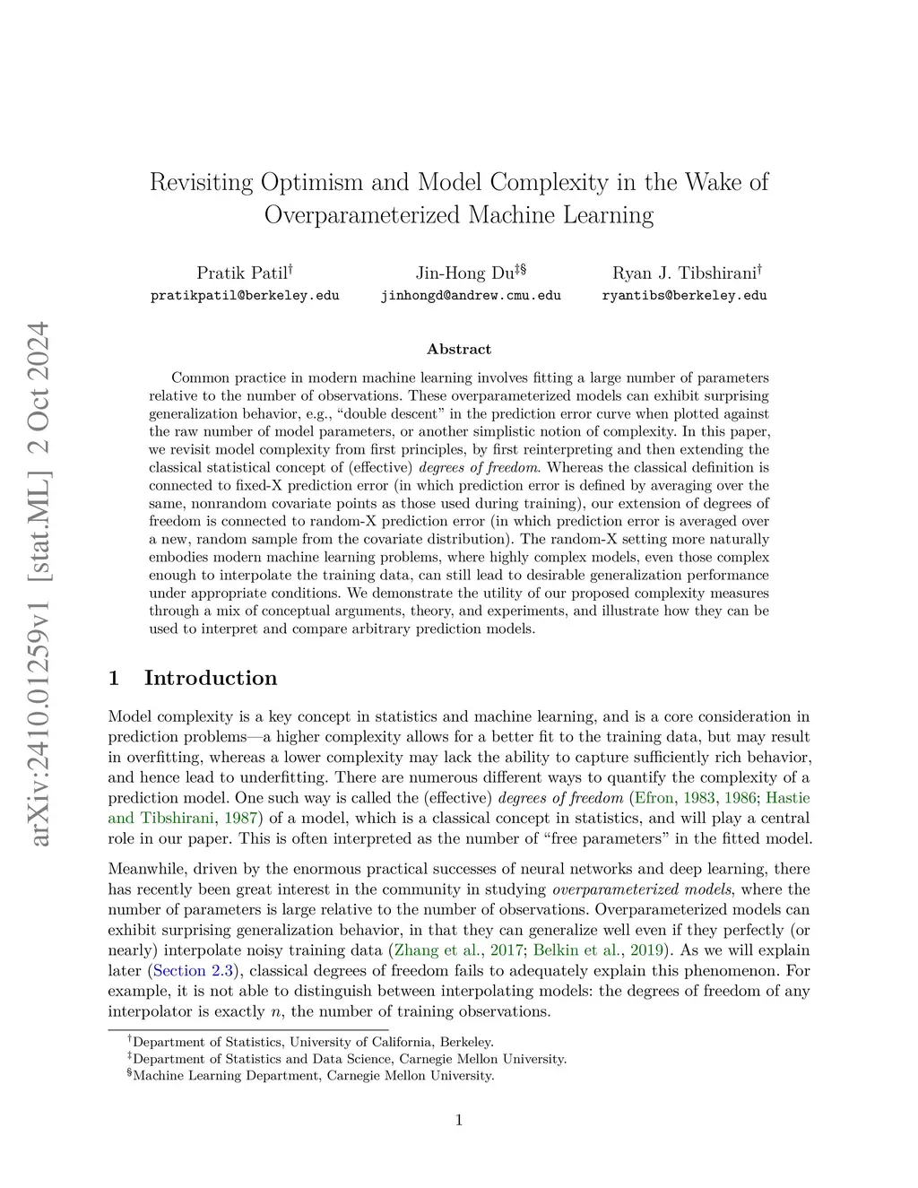 Common practice in modern machine learning involves fitting a large number of parameters relative to the number of observations. These overparameterized models can exhibit surprising generalization behavior, e.g., ``double descent'' in the prediction error curve when plotted against the raw number of model parameters, or another simplistic notion of complexity. In this paper, we revisit model complexity from first principles, by first reinterpreting and then extending the classical statistical concept of (effective) degrees of freedom. Whereas the classical definition is connected to fixed-X prediction error (in which prediction error is defined by averaging over the same, nonrandom covariate points as those used during training), our extension of degrees of freedom is connected to random-X prediction error (in which prediction error is averaged over a new, random sample from the covariate distribution). The random-X setting more naturally embodies modern machine learning problems, where highly complex models, even those complex enough to interpolate the training data, can still lead to desirable generalization performance under appropriate conditions. We demonstrate the utility of our proposed complexity measures through a mix of conceptual arguments, theory, and experiments, and illustrate how they can be used to interpret and compare arbitrary prediction models.