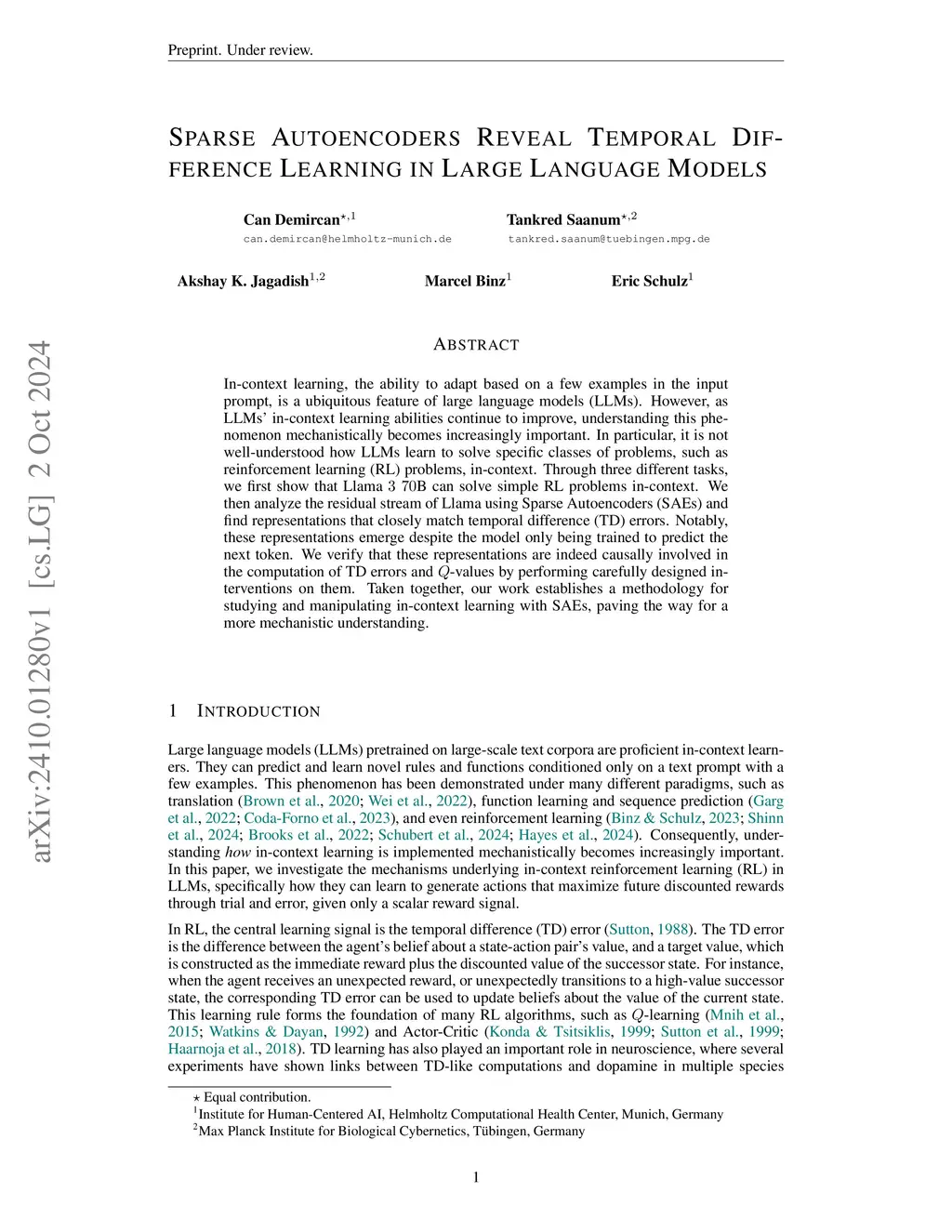 In-context learning, the ability to adapt based on a few examples in the input prompt, is a ubiquitous feature of large language models (LLMs). However, as LLMs' in-context learning abilities continue to improve, understanding this phenomenon mechanistically becomes increasingly important. In particular, it is not well-understood how LLMs learn to solve specific classes of problems, such as reinforcement learning (RL) problems, in-context. Through three different tasks, we first show that Llama B can solve simple RL problems in-context. We then analyze the residual stream of Llama using Sparse Autoencoders (SAEs) and find representations that closely match temporal difference (TD) errors. Notably, these representations emerge despite the model only being trained to predict the next token. We verify that these representations are indeed causally involved in the computation of TD errors and -values by performing carefully designed interventions on them. Taken together, our work establishes a methodology for studying and manipulating in-context learning with SAEs, paving the way for a more mechanistic understanding.