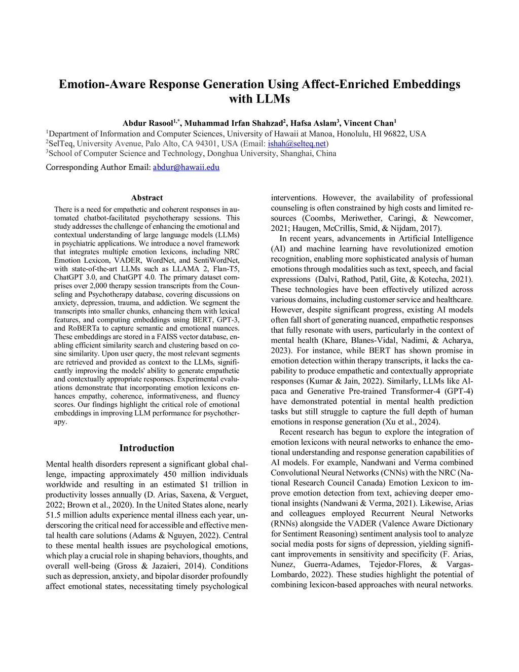 Empathetic and coherent responses are critical in auto-mated chatbot-facilitated psychotherapy. This study addresses the challenge of enhancing the emotional and contextual understanding of large language models (LLMs) in psychiatric applications. We introduce Emotion-Aware Embedding Fusion, a novel framework integrating hierarchical fusion and attention mechanisms to prioritize semantic and emotional features in therapy transcripts. Our approach combines multiple emotion lexicons, including NRC Emotion Lexicon, VADER, WordNet, and SentiWordNet, with state-of-the-art LLMs such as Flan-T5, LLAMA 2, DeepSeek-R1, and ChatGPT 4. Therapy session transcripts, comprising over 2,000 samples are segmented into hierarchical levels (word, sentence, and session) using neural networks, while hierarchical fusion combines these features with pooling techniques to refine emotional representations. Atten-tion mechanisms, including multi-head self-attention and cross-attention, further prioritize emotional and contextual features, enabling temporal modeling of emotion-al shifts across sessions. The processed embeddings, computed using BERT, GPT-3, and RoBERTa are stored in the Facebook AI similarity search vector database, which enables efficient similarity search and clustering across dense vector spaces. Upon user queries, relevant segments are retrieved and provided as context to LLMs, enhancing their ability to generate empathetic and con-textually relevant responses. The proposed framework is evaluated across multiple practical use cases to demonstrate real-world applicability, including AI-driven therapy chatbots. The system can be integrated into existing mental health platforms to generate personalized responses based on retrieved therapy session data.