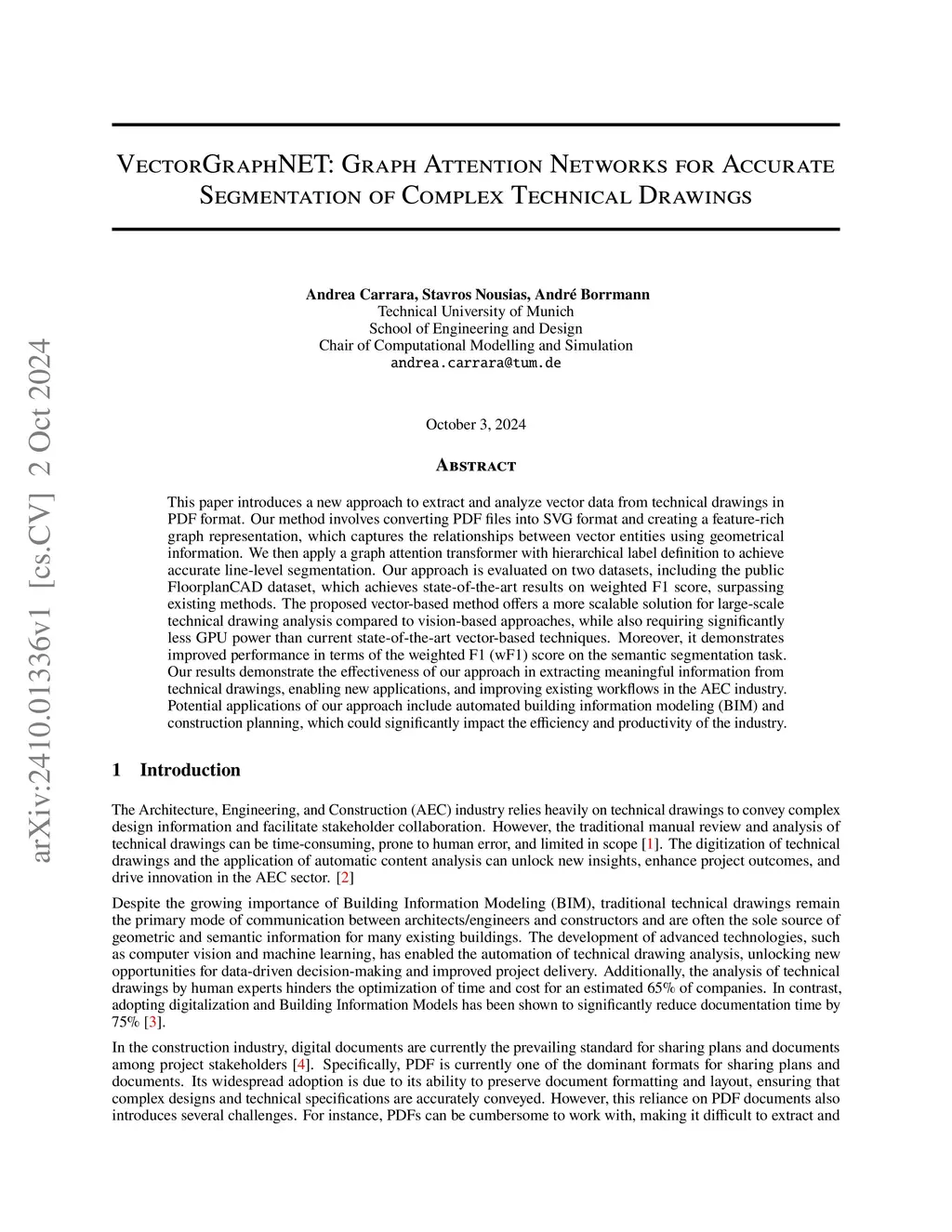 This paper introduces a new approach to extract and analyze vector data from technical drawings in PDF format. Our method involves converting PDF files into SVG format and creating a feature-rich graph representation, which captures the relationships between vector entities using geometrical information. We then apply a graph attention transformer with hierarchical label definition to achieve accurate line-level segmentation. Our approach is evaluated on two datasets, including the public FloorplanCAD dataset, which achieves state-of-the-art results on weighted F1 score, surpassing existing methods. The proposed vector-based method offers a more scalable solution for large-scale technical drawing analysis compared to vision-based approaches, while also requiring significantly less GPU power than current state-of-the-art vector-based techniques. Moreover, it demonstrates improved performance in terms of the weighted F1 (wF1) score on the semantic segmentation task. Our results demonstrate the effectiveness of our approach in extracting meaningful information from technical drawings, enabling new applications, and improving existing workflows in the AEC industry. Potential applications of our approach include automated building information modeling (BIM) and construction planning, which could significantly impact the efficiency and productivity of the industry.