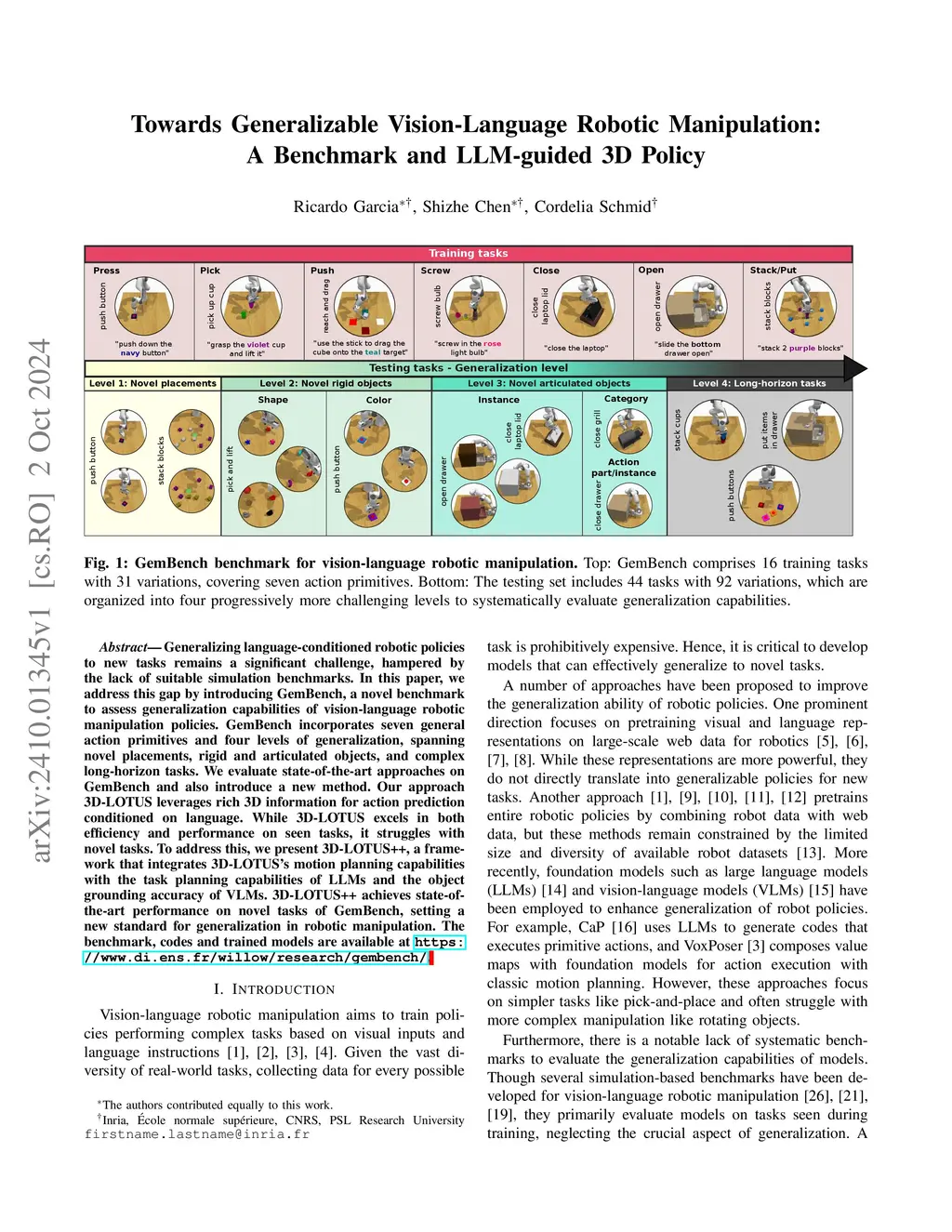 Generalizing language-conditioned robotic policies to new tasks remains a significant challenge, hampered by the lack of suitable simulation benchmarks. In this paper, we address this gap by introducing GemBench, a novel benchmark to assess generalization capabilities of vision-language robotic manipulation policies. GemBench incorporates seven general action primitives and four levels of generalization, spanning novel placements, rigid and articulated objects, and complex long-horizon tasks. We evaluate state-of-the-art approaches on GemBench and also introduce a new method. Our approach 3D-LOTUS leverages rich 3D information for action prediction conditioned on language. While 3D-LOTUS excels in both efficiency and performance on seen tasks, it struggles with novel tasks. To address this, we present 3D-LOTUS++, a framework that integrates 3D-LOTUS's motion planning capabilities with the task planning capabilities of LLMs and the object grounding accuracy of VLMs. 3D-LOTUS++ achieves state-of-the-art performance on novel tasks of GemBench, setting a new standard for generalization in robotic manipulation. The benchmark, codes and trained models are available atthis https URL.