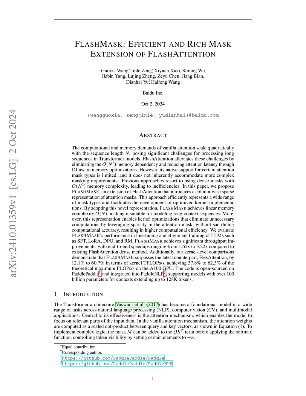 The computational and memory demands of vanilla attention scale quadratically with the sequence length , posing significant challenges for processing long sequences in Transformer models. FlashAttention alleviates these challenges by eliminating the memory dependency and reducing attention latency through IO-aware memory optimizations. However, its native support for certain attention mask types is limited, and it does not inherently accommodate more complex masking requirements. Previous approaches resort to using dense masks with memory complexity, leading to inefficiencies. In this paper, we propose FlashMask, an extension of FlashAttention that introduces a column-wise sparse representation of attention masks. This approach efficiently represents a wide range of mask types and facilitates the development of optimized kernel implementations. By adopting this novel representation, FlashMask achieves linear memory complexity , suitable for modeling long-context sequences. Moreover, this representation enables kernel optimizations that eliminate unnecessary computations by leveraging sparsity in the attention mask, without sacrificing computational accuracy, resulting in higher computational efficiency. We evaluate FlashMask's performance in fine-tuning and alignment training of LLMs such as SFT, LoRA, DPO, and RM. FlashMask achieves significant throughput improvements, with end-to-end speedups ranging from 1.65x to 3.22x compared to existing FlashAttention dense method. Additionally, our kernel-level comparisons demonstrate that FlashMask surpasses the latest counterpart, FlexAttention, by 12.1% to 60.7% in terms of kernel TFLOPs/s, achieving 37.8% to 62.3% of the theoretical maximum FLOPs/s on the A100 GPU. The code is open-sourced on PaddlePaddle and integrated into PaddleNLP, supporting models with over 100 billion parameters for contexts up to 128K tokens.