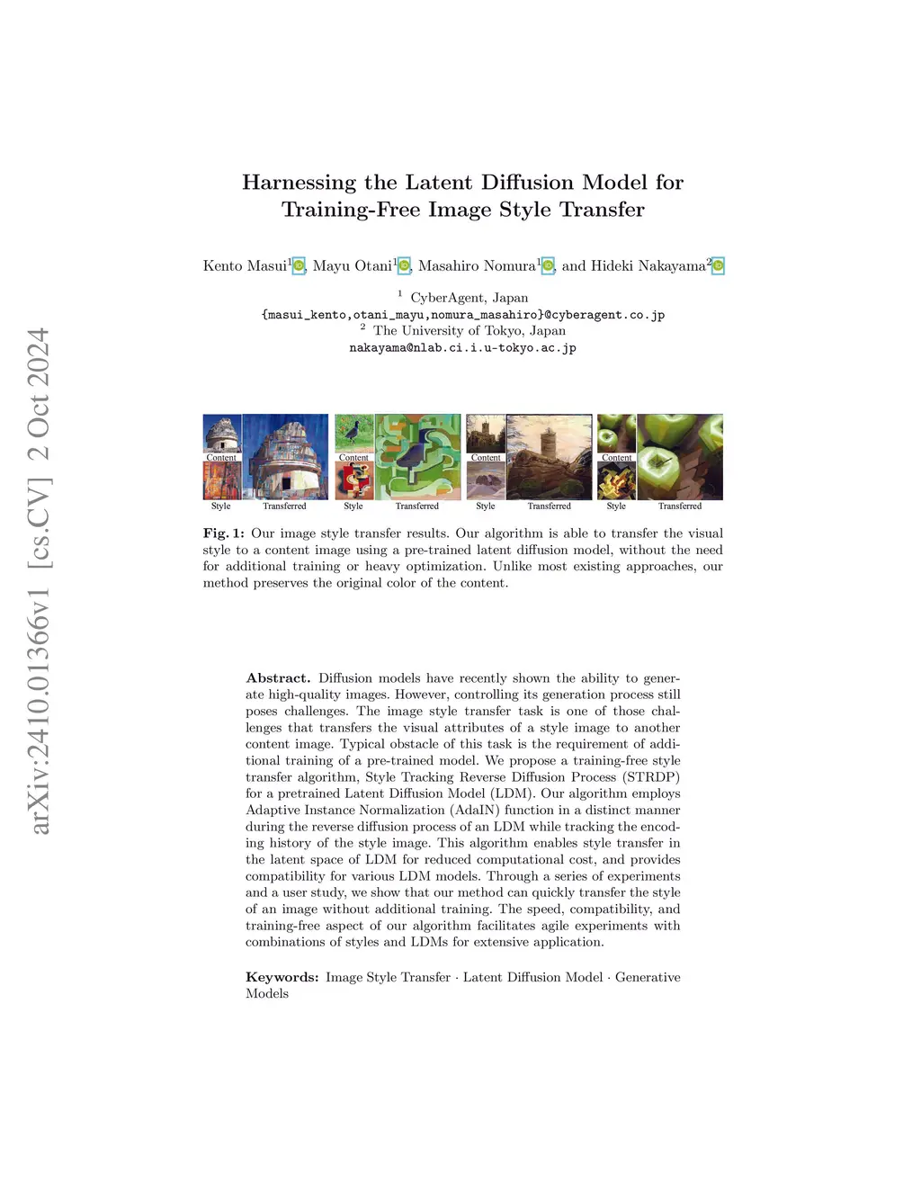 Diffusion models have recently shown the ability to generate high-quality images. However, controlling its generation process still poses challenges. The image style transfer task is one of those challenges that transfers the visual attributes of a style image to another content image. Typical obstacle of this task is the requirement of additional training of a pre-trained model. We propose a training-free style transfer algorithm, Style Tracking Reverse Diffusion Process (STRDP) for a pretrained Latent Diffusion Model (LDM). Our algorithm employs Adaptive Instance Normalization (AdaIN) function in a distinct manner during the reverse diffusion process of an LDM while tracking the encoding history of the style image. This algorithm enables style transfer in the latent space of LDM for reduced computational cost, and provides compatibility for various LDM models. Through a series of experiments and a user study, we show that our method can quickly transfer the style of an image without additional training. The speed, compatibility, and training-free aspect of our algorithm facilitates agile experiments with combinations of styles and LDMs for extensive application.