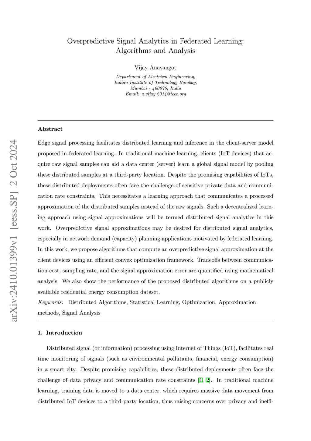 Edge signal processing facilitates distributed learning and inference in the client-server model proposed in federated learning. In traditional machine learning, clients (IoT devices) that acquire raw signal samples can aid a data center (server) learn a global signal model by pooling these distributed samples at a third-party location. Despite the promising capabilities of IoTs, these distributed deployments often face the challenge of sensitive private data and communication rate constraints. This necessitates a learning approach that communicates a processed approximation of the distributed samples instead of the raw signals. Such a decentralized learning approach using signal approximations will be termed distributed signal analytics in this work. Overpredictive signal approximations may be desired for distributed signal analytics, especially in network demand (capacity) planning applications motivated by federated learning. In this work, we propose algorithms that compute an overpredictive signal approximation at the client devices using an efficient convex optimization framework. Tradeoffs between communication cost, sampling rate, and the signal approximation error are quantified using mathematical analysis. We also show the performance of the proposed distributed algorithms on a publicly available residential energy consumption dataset.