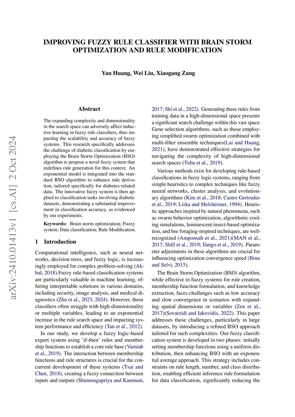 The expanding complexity and dimensionality in the search space can adversely affect inductive learning in fuzzy rule classifiers, thus impacting the scalability and accuracy of fuzzy systems. This research specifically addresses the challenge of diabetic classification by employing the Brain Storm Optimization (BSO) algorithm to propose a novel fuzzy system that redefines rule generation for this context. An exponential model is integrated into the standard BSO algorithm to enhance rule derivation, tailored specifically for diabetes-related data. The innovative fuzzy system is then applied to classification tasks involving diabetic datasets, demonstrating a substantial improvement in classification accuracy, as evidenced by our experiments.