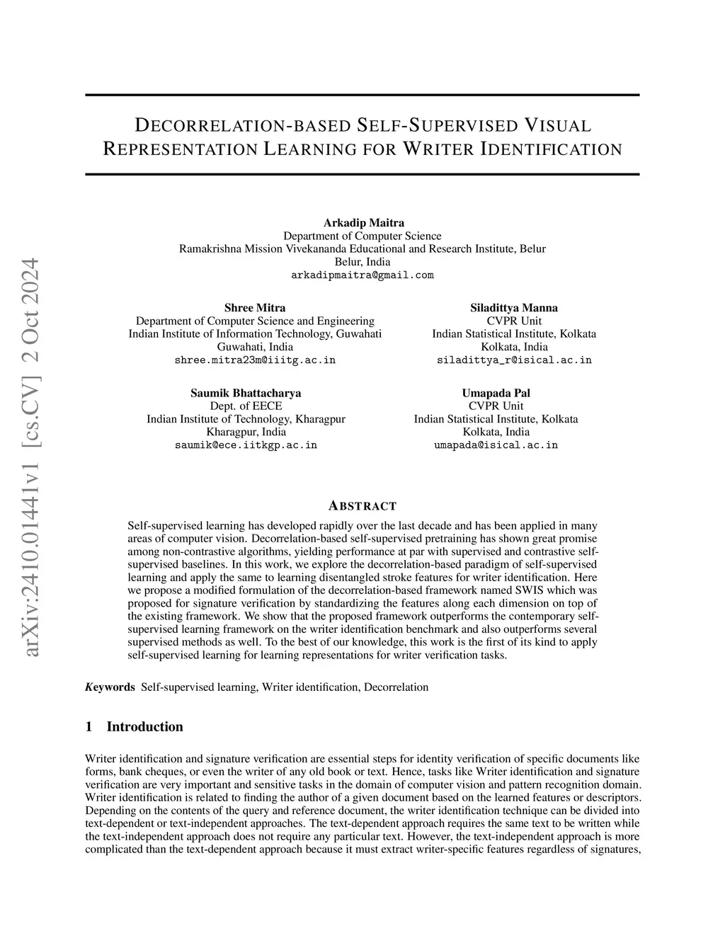 Self-supervised learning has developed rapidly over the last decade and has been applied in many areas of computer vision. Decorrelation-based self-supervised pretraining has shown great promise among non-contrastive algorithms, yielding performance at par with supervised and contrastive self-supervised baselines. In this work, we explore the decorrelation-based paradigm of self-supervised learning and apply the same to learning disentangled stroke features for writer identification. Here we propose a modified formulation of the decorrelation-based framework named SWIS which was proposed for signature verification by standardizing the features along each dimension on top of the existing framework. We show that the proposed framework outperforms the contemporary self-supervised learning framework on the writer identification benchmark and also outperforms several supervised methods as well. To the best of our knowledge, this work is the first of its kind to apply self-supervised learning for learning representations for writer verification tasks.