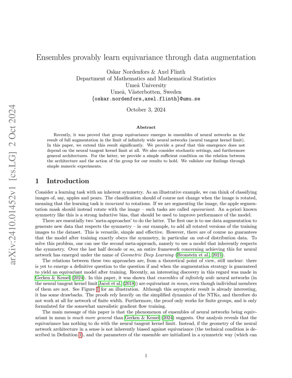 Recently, it was proved that group equivariance emerges in ensembles of neural networks as the result of full augmentation in the limit of infinitely wide neural networks (neural tangent kernel limit). In this paper, we extend this result significantly. We provide a proof that this emergence does not depend on the neural tangent kernel limit at all. We also consider stochastic settings, and furthermore general architectures. For the latter, we provide a simple sufficient condition on the relation between the architecture and the action of the group for our results to hold. We validate our findings through simple numeric experiments.