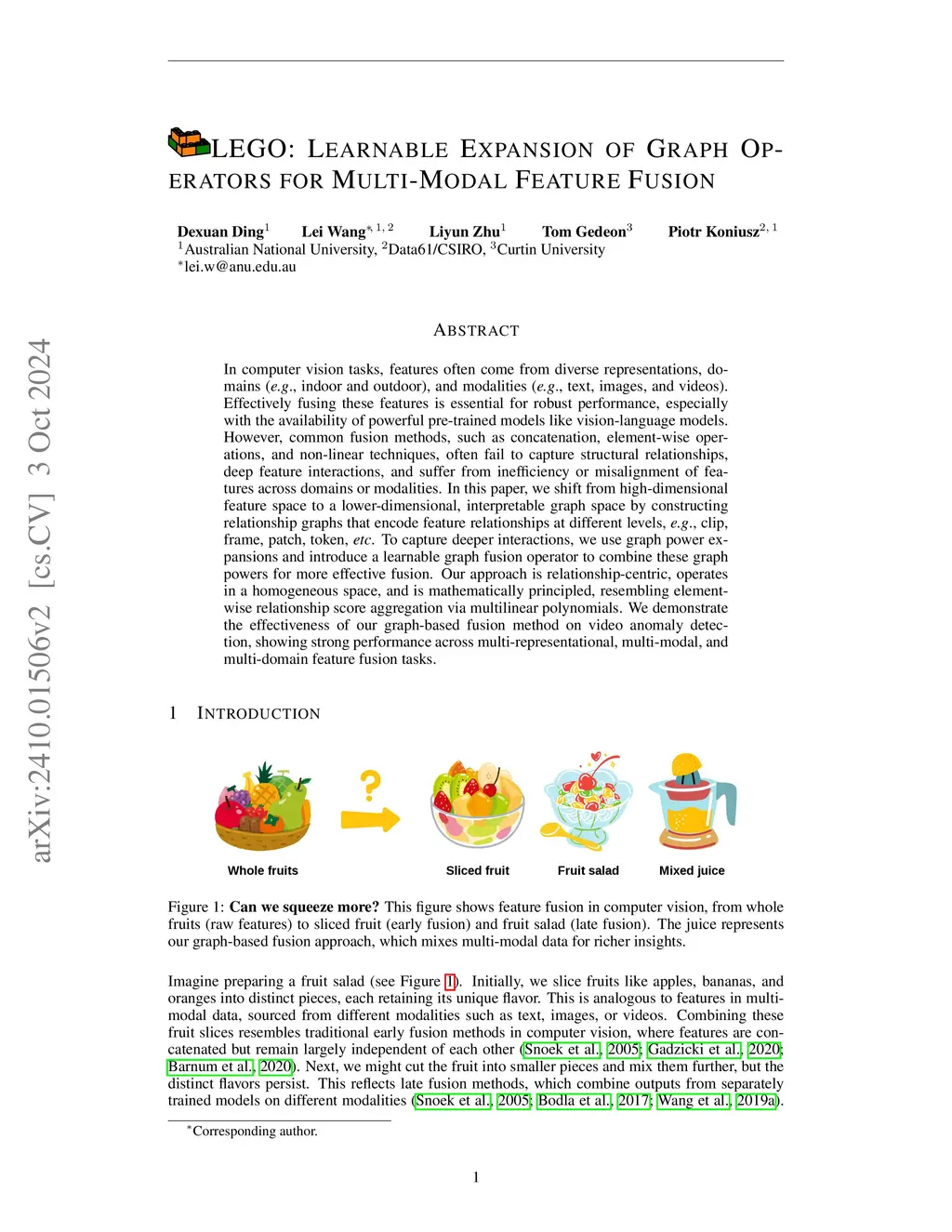 In computer vision tasks, features often come from diverse representations, domains (e.g., indoor and outdoor), and modalities (e.g., text, images, and videos). Effectively fusing these features is essential for robust performance, especially with the availability of powerful pre-trained models like vision-language models. However, common fusion methods, such as concatenation, element-wise operations, and non-linear techniques, often fail to capture structural relationships, deep feature interactions, and suffer from inefficiency or misalignment of features across domains or modalities. In this paper, we shift from high-dimensional feature space to a lower-dimensional, interpretable graph space by constructing relationship graphs that encode feature relationships at different levels, e.g., clip, frame, patch, token, etc. To capture deeper interactions, we expand graphs through iterative graph relationship updates and introduce a learnable graph fusion operator to integrate these expanded relationships for more effective fusion. Our approach is relationship-centric, operates in a homogeneous space, and is mathematically principled, resembling element-wise relationship score aggregation via multilinear polynomials. We demonstrate the effectiveness of our graph-based fusion method on video anomaly detection, showing strong performance across multi-representational, multi-modal, and multi-domain feature fusion tasks.