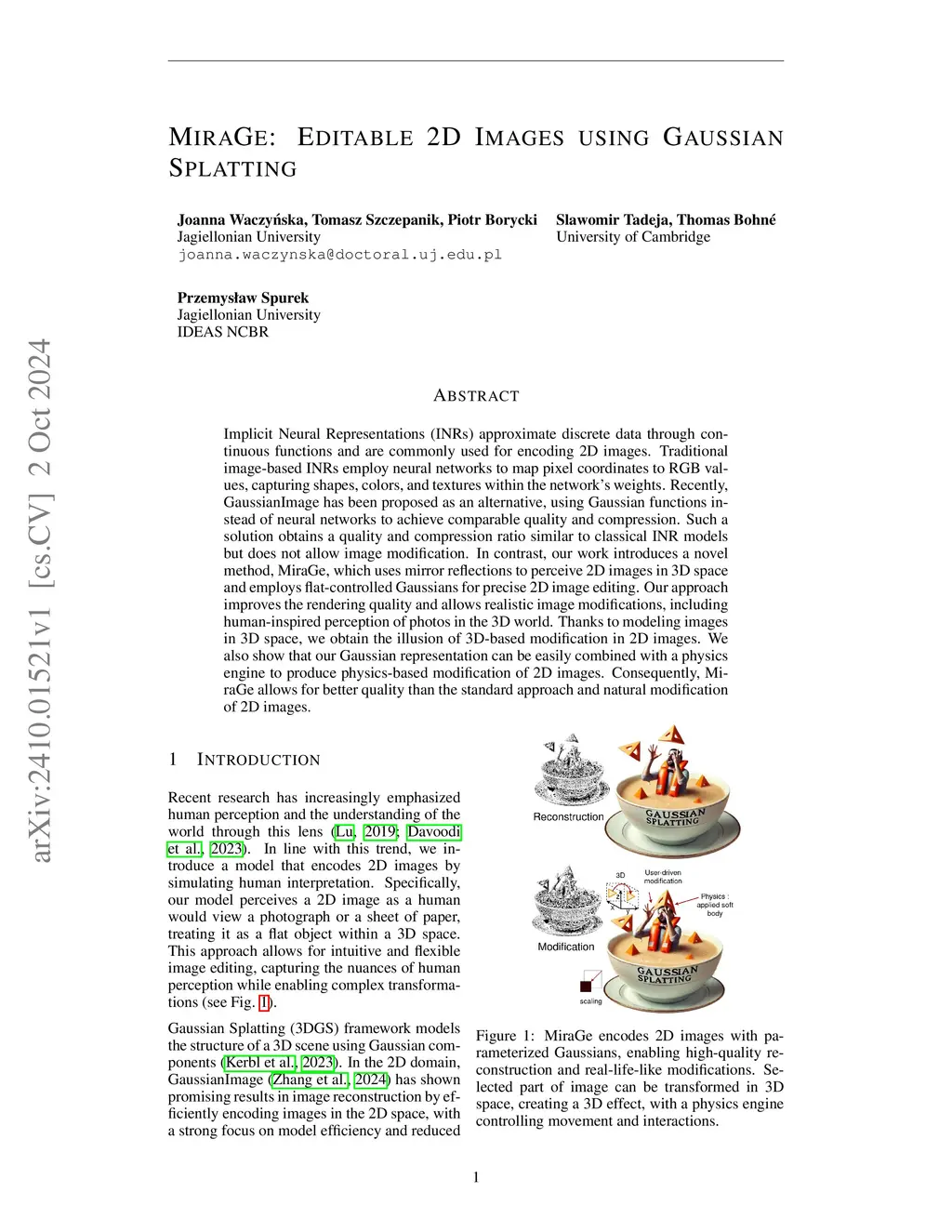 Implicit Neural Representations (INRs) approximate discrete data through continuous functions and are commonly used for encoding 2D images. Traditional image-based INRs employ neural networks to map pixel coordinates to RGB values, capturing shapes, colors, and textures within the network's weights. Recently, GaussianImage has been proposed as an alternative, using Gaussian functions instead of neural networks to achieve comparable quality and compression. Such a solution obtains a quality and compression ratio similar to classical INR models but does not allow image modification. In contrast, our work introduces a novel method, MiraGe, which uses mirror reflections to perceive 2D images in 3D space and employs flat-controlled Gaussians for precise 2D image editing. Our approach improves the rendering quality and allows realistic image modifications, including human-inspired perception of photos in the 3D world. Thanks to modeling images in 3D space, we obtain the illusion of 3D-based modification in 2D images. We also show that our Gaussian representation can be easily combined with a physics engine to produce physics-based modification of 2D images. Consequently, MiraGe allows for better quality than the standard approach and natural modification of 2D images