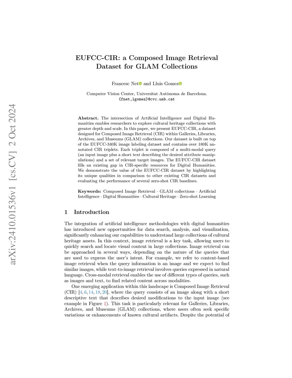 The intersection of Artificial Intelligence and Digital Humanities enables researchers to explore cultural heritage collections with greater depth and scale. In this paper, we present EUFCC-CIR, a dataset designed for Composed Image Retrieval (CIR) within Galleries, Libraries, Archives, and Museums (GLAM) collections. Our dataset is built on top of the EUFCC-340K image labeling dataset and contains over 180K annotated CIR triplets. Each triplet is composed of a multi-modal query (an input image plus a short text describing the desired attribute manipulations) and a set of relevant target images. The EUFCC-CIR dataset fills an existing gap in CIR-specific resources for Digital Humanities. We demonstrate the value of the EUFCC-CIR dataset by highlighting its unique qualities in comparison to other existing CIR datasets and evaluating the performance of several zero-shot CIR baselines.