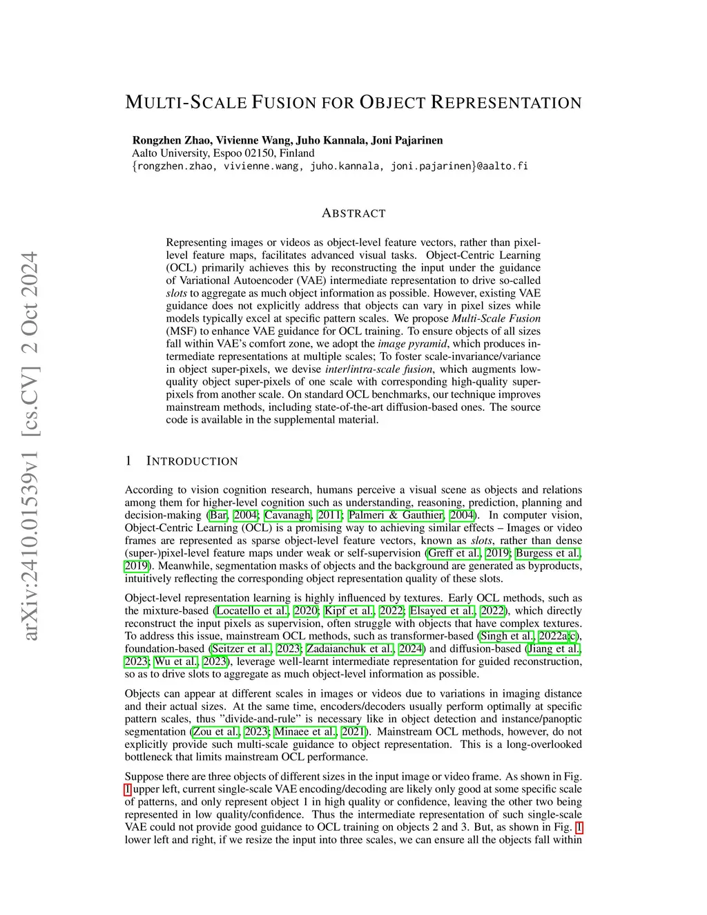 Representing images or videos as object-level feature vectors, rather than pixel-level feature maps, facilitates advanced visual tasks. Object-Centric Learning (OCL) primarily achieves this by reconstructing the input under the guidance of Variational Autoencoder (VAE) intermediate representation to drive so-called \textit{slots} to aggregate as much object information as possible. However, existing VAE guidance does not explicitly address that objects can vary in pixel sizes while models typically excel at specific pattern scales. We propose \textit{Multi-Scale Fusion} (MSF) to enhance VAE guidance for OCL training. To ensure objects of all sizes fall within VAE's comfort zone, we adopt the \textit{image pyramid}, which produces intermediate representations at multiple scales; To foster scale-invariance/variance in object super-pixels, we devise \textit{inter}/\textit{intra-scale fusion}, which augments low-quality object super-pixels of one scale with corresponding high-quality super-pixels from another scale. On standard OCL benchmarks, our technique improves mainstream methods, including state-of-the-art diffusion-based ones. The source code is available onthis https URL.