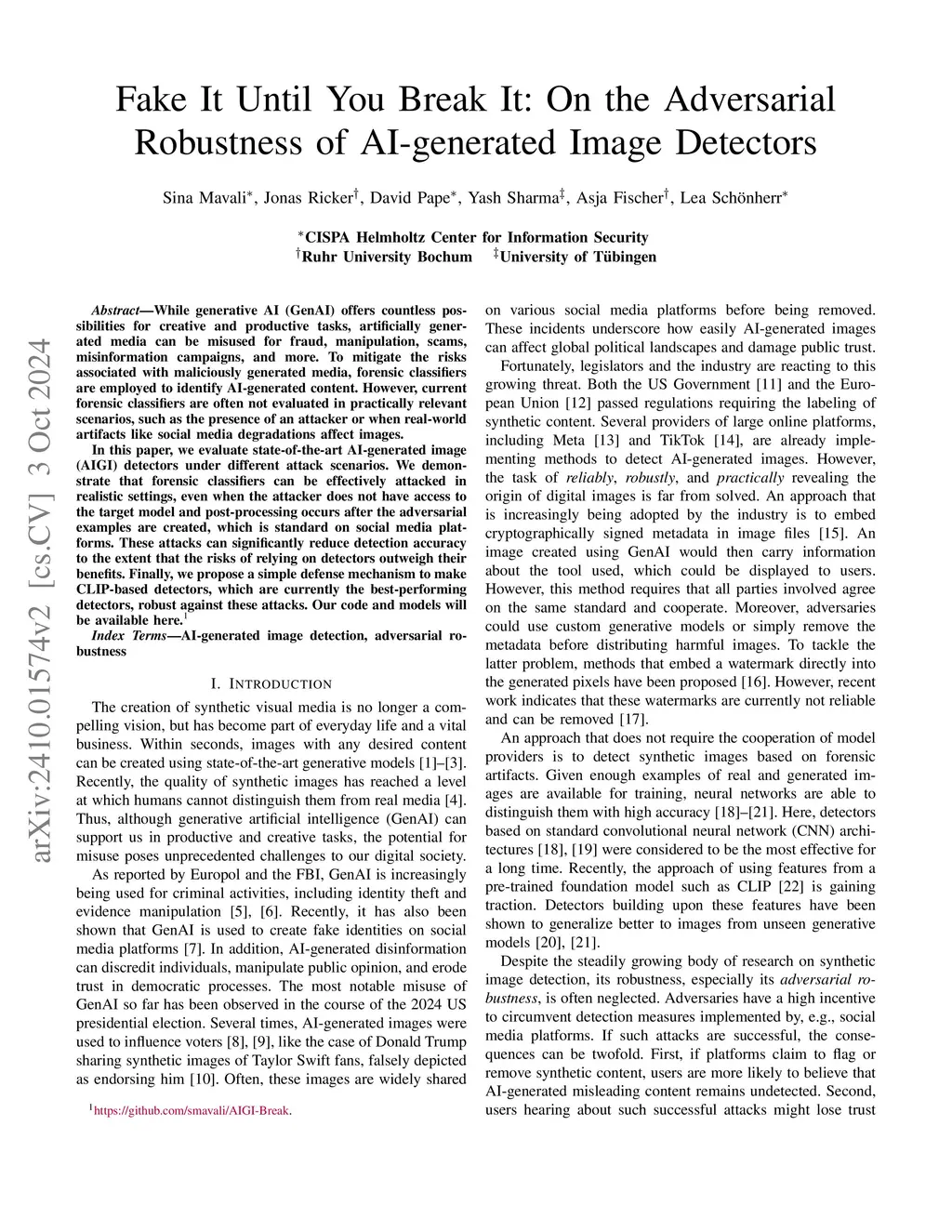 The rapid advancement of Generative Artificial Intelligence (GenAI) capabilities is accompanied by a concerning rise in its misuse. In particular the generation of credible misinformation in the form of images poses a significant threat to the public trust in democratic processes. Consequently, there is an urgent need to develop tools to reliably distinguish between authentic and AI-generated content. The majority of detection methods are based on neural networks that are trained to recognize forensic artifacts. In this work, we demonstrate that current state-of-the-art classifiers are vulnerable to adversarial examples under real-world conditions. Through extensive experiments, comprising four detection methods and five attack algorithms, we show that an attacker can dramatically decrease classification performance, without internal knowledge of the detector's architecture. Notably, most attacks remain effective even when images are degraded during the upload to, e.g., social media platforms. In a case study, we demonstrate that these robustness challenges are also found in commercial tools by conducting black-box attacks on HIVE, a proprietary online GenAI media detector. In addition, we evaluate the robustness of using generated features of a robust pre-trained model and showed that this increases the robustness, while not reaching the performance on benign inputs. These results, along with the increasing potential of GenAI to erode public trust, underscore the need for more research and new perspectives on methods to prevent its misuse.