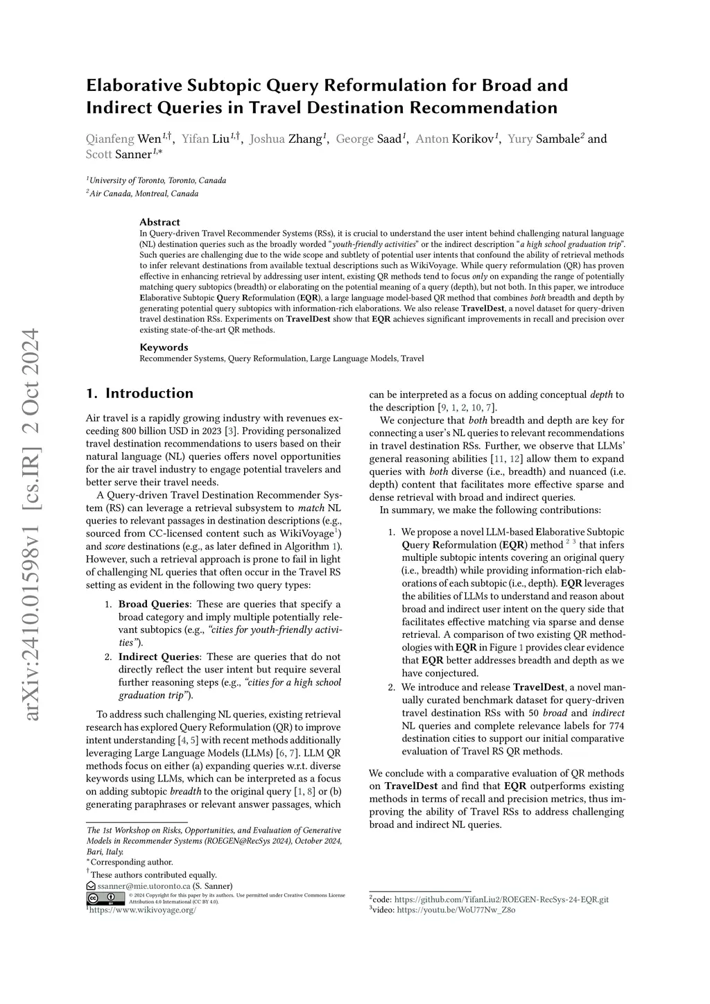 In Query-driven Travel Recommender Systems (RSs), it is crucial to understand the user intent behind challenging natural language(NL) destination queries such as the broadly worded "youth-friendly activities" or the indirect description "a high school graduation trip". Such queries are challenging due to the wide scope and subtlety of potential user intents that confound the ability of retrieval methods to infer relevant destinations from available textual descriptions such as WikiVoyage. While query reformulation (QR) has proven effective in enhancing retrieval by addressing user intent, existing QR methods tend to focus only on expanding the range of potentially matching query subtopics (breadth) or elaborating on the potential meaning of a query (depth), but not both. In this paper, we introduce Elaborative Subtopic Query Reformulation (EQR), a large language model-based QR method that combines both breadth and depth by generating potential query subtopics with information-rich elaborations. We also release TravelDest, a novel dataset for query-driven travel destination RSs. Experiments on TravelDest show that EQR achieves significant improvements in recall and precision over existing state-of-the-art QR methods.