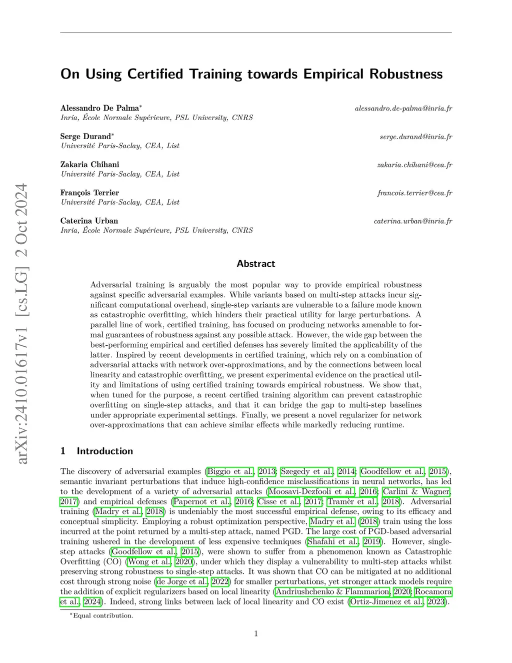 Adversarial training is arguably the most popular way to provide empirical robustness against specific adversarial examples. While variants based on multi-step attacks incur significant computational overhead, single-step variants are vulnerable to a failure mode known as catastrophic overfitting, which hinders their practical utility for large perturbations. A parallel line of work, certified training, has focused on producing networks amenable to formal guarantees of robustness against any possible attack. However, the wide gap between the best-performing empirical and certified defenses has severely limited the applicability of the latter. Inspired by recent developments in certified training, which rely on a combination of adversarial attacks with network over-approximations, and by the connections between local linearity and catastrophic overfitting, we present experimental evidence on the practical utility and limitations of using certified training towards empirical robustness. We show that, when tuned for the purpose, a recent certified training algorithm can prevent catastrophic overfitting on single-step attacks, and that it can bridge the gap to multi-step baselines under appropriate experimental settings. Finally, we present a conceptually simple regularizer for network over-approximations that can achieve similar effects while markedly reducing runtime.