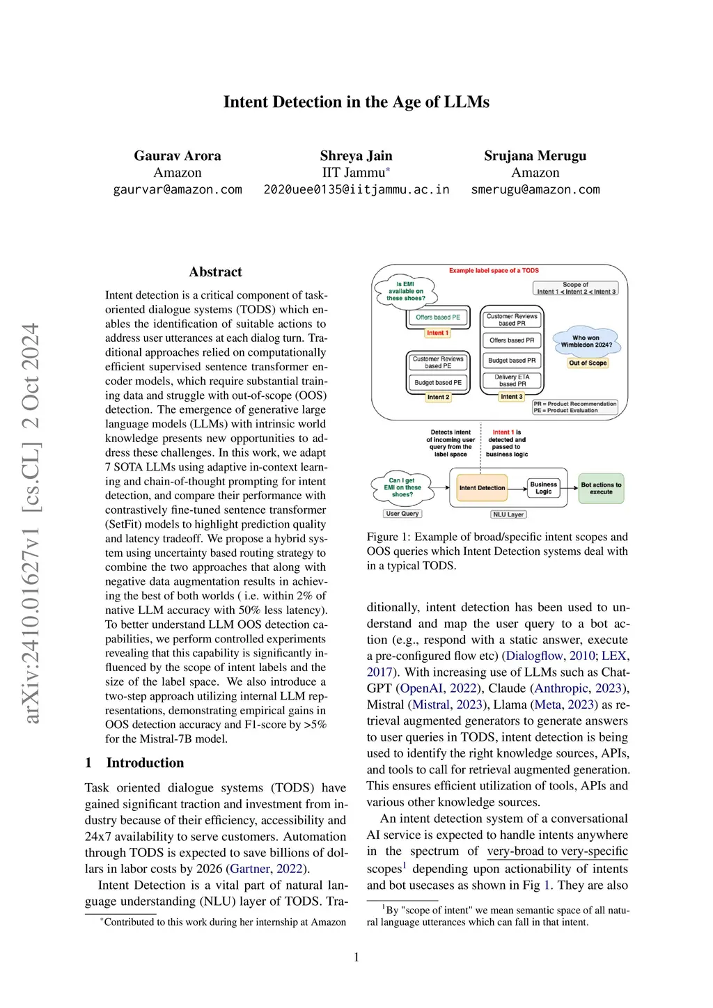 Intent detection is a critical component of task-oriented dialogue systems (TODS) which enables the identification of suitable actions to address user utterances at each dialog turn. Traditional approaches relied on computationally efficient supervised sentence transformer encoder models, which require substantial training data and struggle with out-of-scope (OOS) detection. The emergence of generative large language models (LLMs) with intrinsic world knowledge presents new opportunities to address these challenges. In this work, we adapt 7 SOTA LLMs using adaptive in-context learning and chain-of-thought prompting for intent detection, and compare their performance with contrastively fine-tuned sentence transformer (SetFit) models to highlight prediction quality and latency tradeoff. We propose a hybrid system using uncertainty based routing strategy to combine the two approaches that along with negative data augmentation results in achieving the best of both worlds ( i.e. within 2% of native LLM accuracy with 50% less latency). To better understand LLM OOS detection capabilities, we perform controlled experiments revealing that this capability is significantly influenced by the scope of intent labels and the size of the label space. We also introduce a two-step approach utilizing internal LLM representations, demonstrating empirical gains in OOS detection accuracy and F1-score by >5% for the Mistral-7B model.
