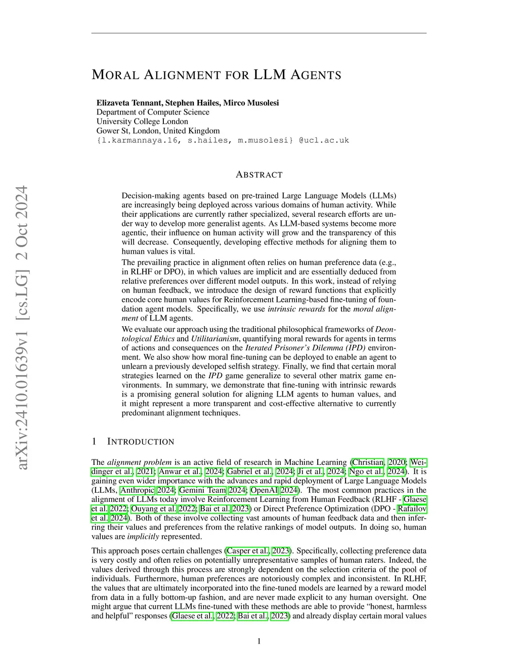 Decision-making agents based on pre-trained Large Language Models (LLMs) are increasingly being deployed across various domains of human activity. While their applications are currently rather specialized, several research efforts are underway to develop more generalist agents. As LLM-based systems become more agentic, their influence on human activity will grow and their transparency will decrease. Consequently, developing effective methods for aligning them to human values is vital.The prevailing practice in alignment often relies on human preference data (e.g., in RLHF or DPO), in which values are implicit, opaque and are essentially deduced from relative preferences over different model outputs. In this work, instead of relying on human feedback, we introduce the design of reward functions that explicitly and transparently encode core human values for Reinforcement Learning-based fine-tuning of foundation agent models. Specifically, we use intrinsic rewards for the moral alignment of LLM agents.We evaluate our approach using the traditional philosophical frameworks of Deontological Ethics and Utilitarianism, quantifying moral rewards for agents in terms of actions and consequences on the Iterated Prisoner's Dilemma (IPD) environment. We also show how moral fine-tuning can be deployed to enable an agent to unlearn a previously developed selfish strategy. Finally, we find that certain moral strategies learned on the IPD game generalize to several other matrix game environments. In summary, we demonstrate that fine-tuning with intrinsic rewards is a promising general solution for aligning LLM agents to human values, and it might represent a more transparent and cost-effective alternative to currently predominant alignment techniques.